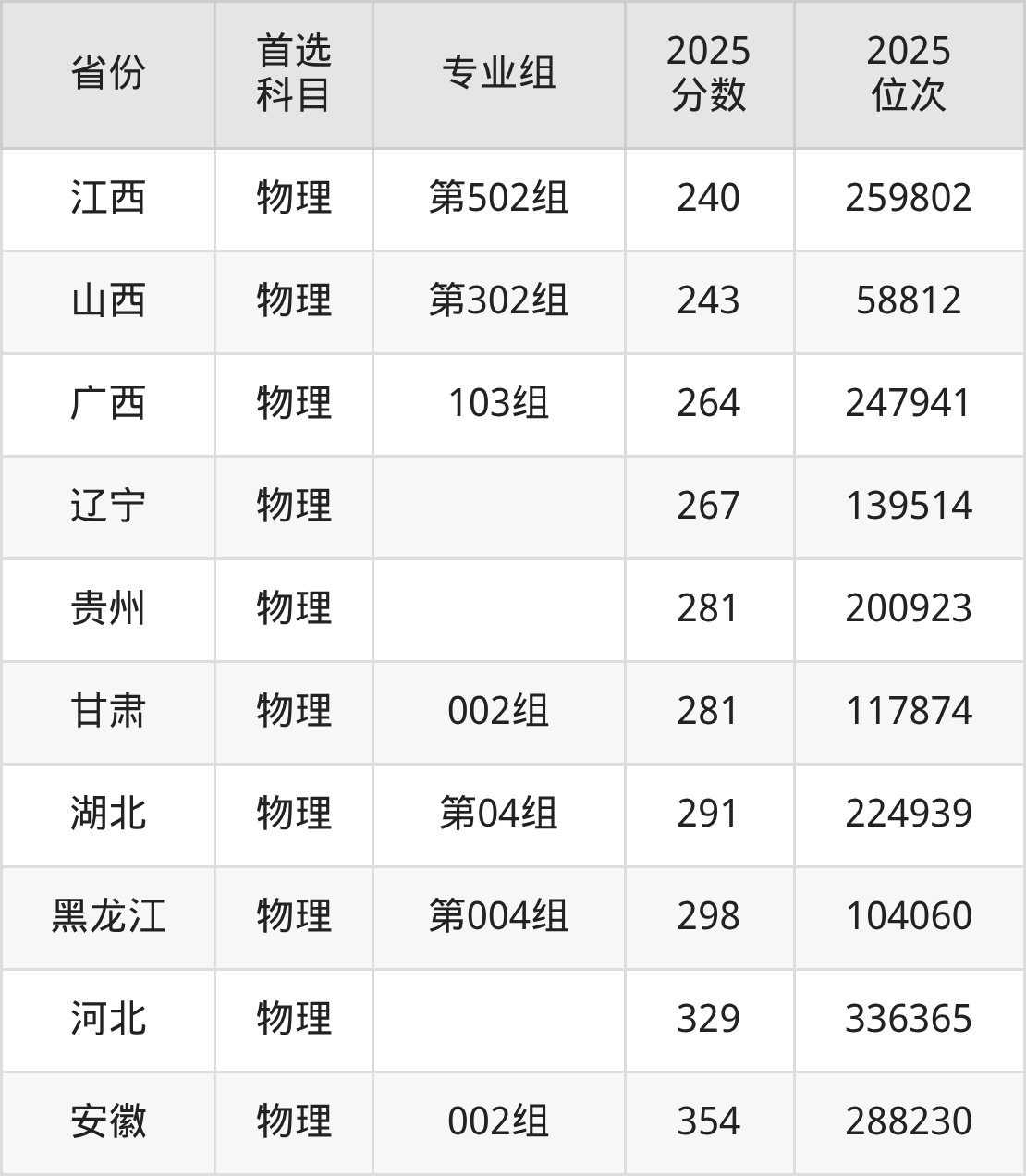 物理类最低分对应地区为四川(专业组101),录取位次为284789;最高分对应地区为安徽(002组),录取位次为288230,超专科线154分。