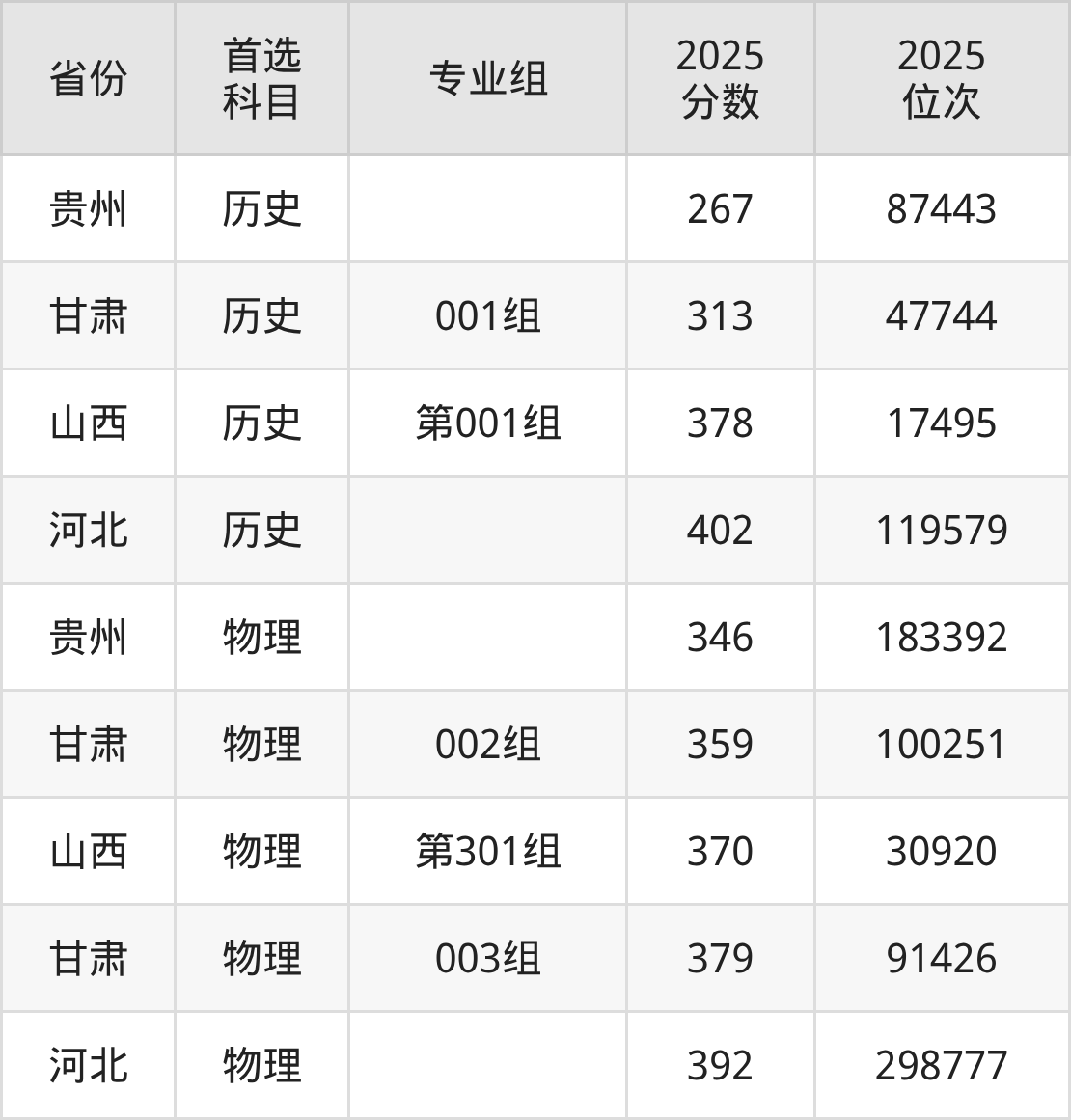历史类最低分对应地区为贵州,录取位次为87443,超专科线87分;最高分对应地区为河北,录取位次为119579,超专科线202分。