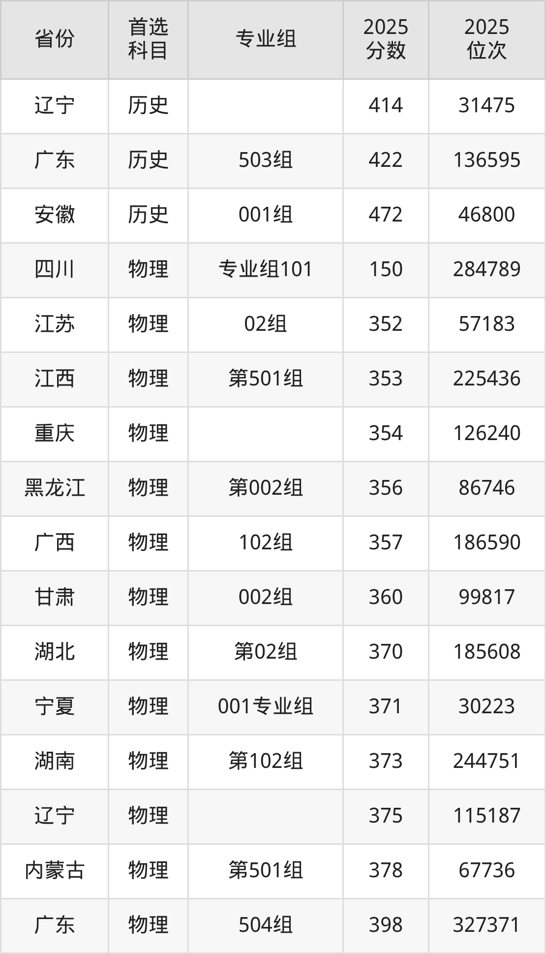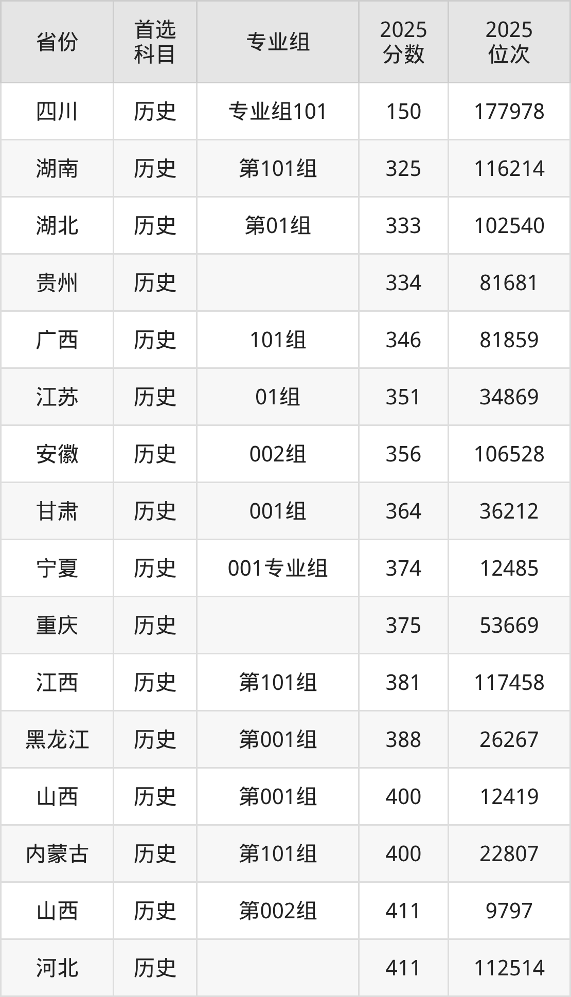 历史类最低分对应地区为四川(专业组101),录取位次为177978;最高分对应地区为安徽(001组),录取位次为46800,超专科线272分。