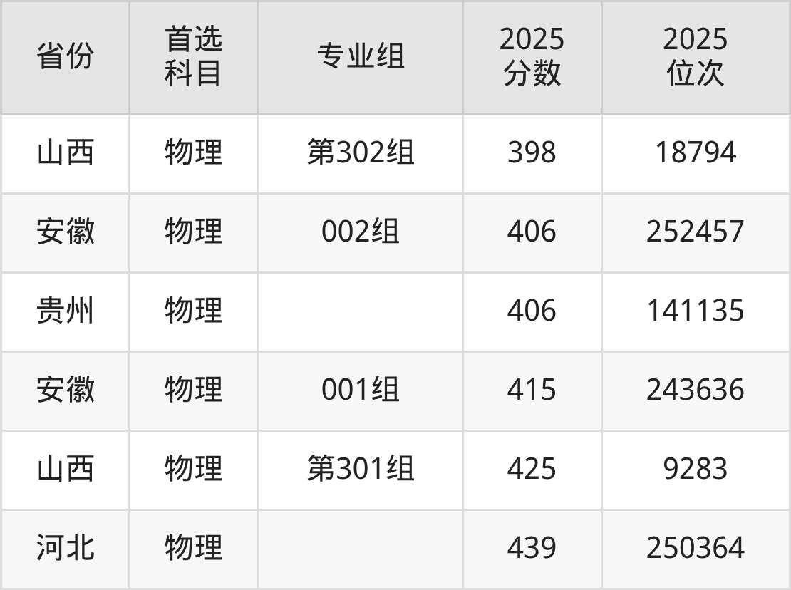 物理类最低分对应地区为四川(专业组101),录取位次为284789;最高分对应地区为河北,录取位次为250364,超专科线239分。
