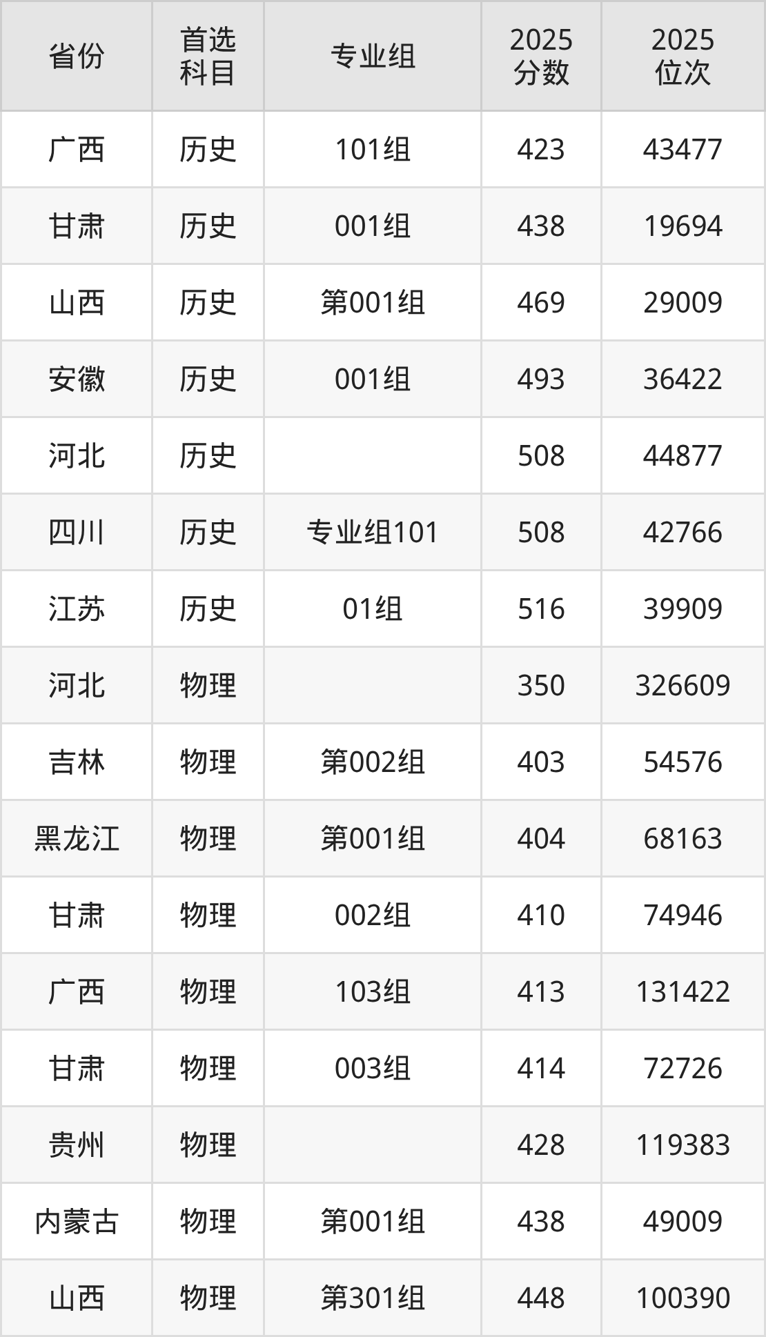 历史类最低分对应地区为广西(101组),录取位次为43477,超本科线21分;最高分对应地区为江苏(01组),录取位次为39909,超本科线34分。