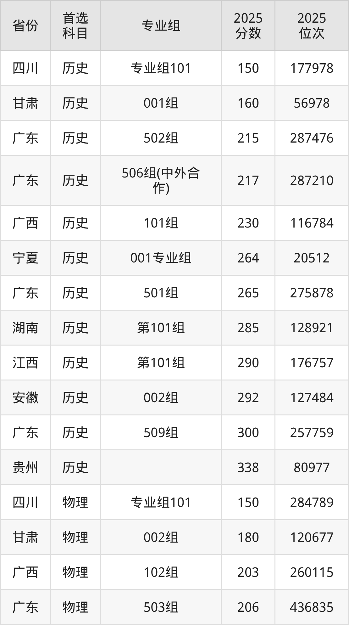 历史类最低分对应地区为四川(专业组101),录取位次为177978;最高分对应地区为贵州,录取位次为80977,超专科线158分。