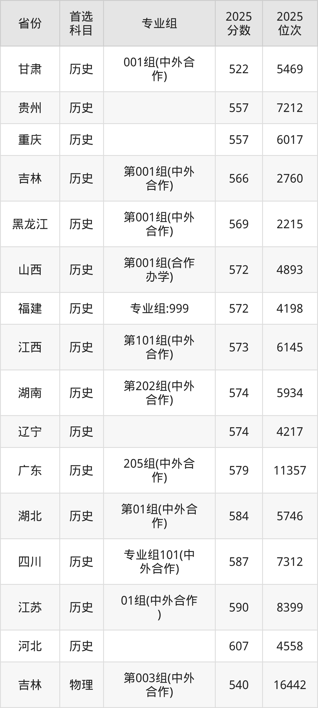 历史类最低分对应地区为甘肃(001组(中外合作)),录取位次为5469;最高分对应地区为河北,录取位次为4558。