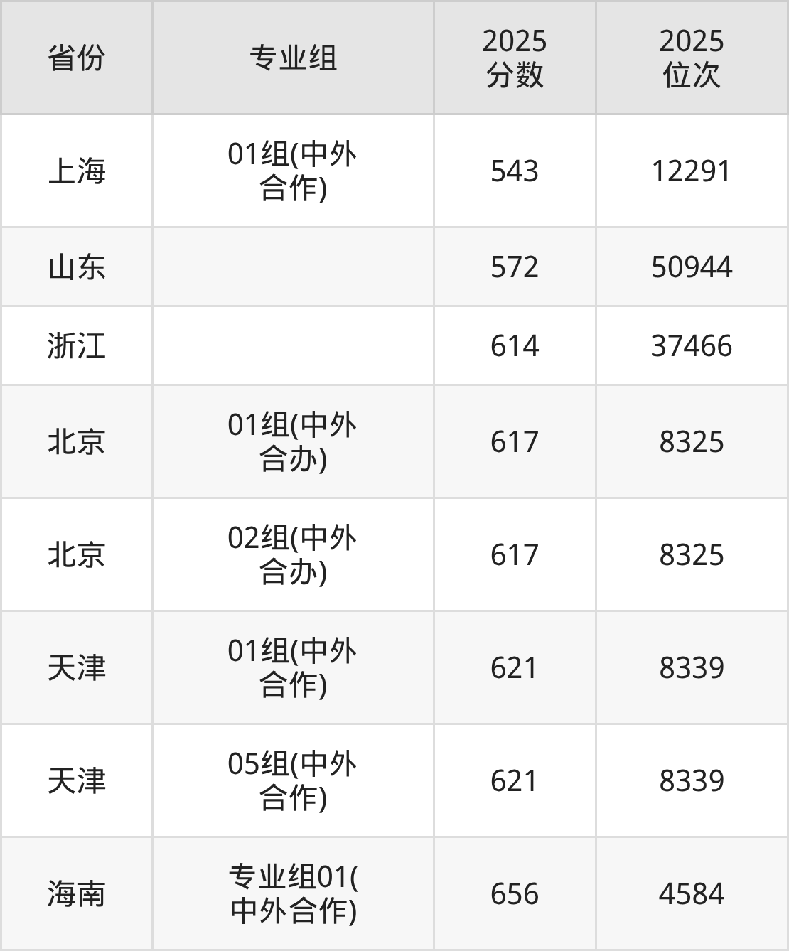 最低分对应地区为上海(01组(中外合作)),录取位次为12291,超本科线141分;最高分对应地区为海南(专业组01(中外合作)),录取位次为4584,超本科线176分。