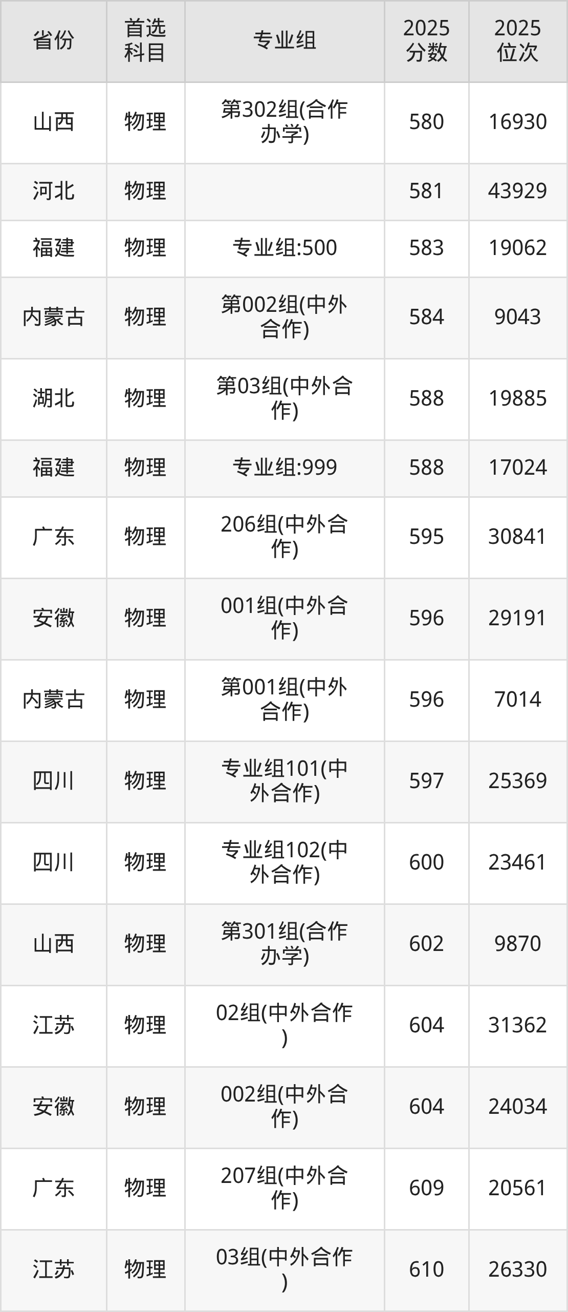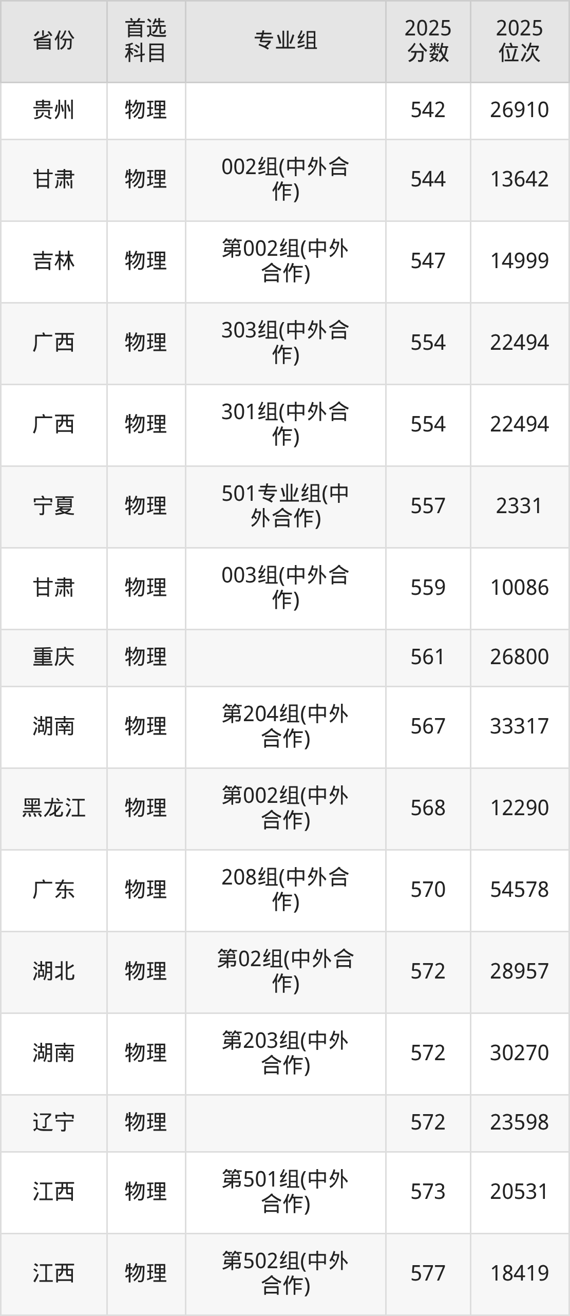 物理类最低分对应地区为吉林(第003组(中外合作)),录取位次为16442;最高分对应地区为江苏(03组(中外合作)),录取位次为26330,超本科线147分。
