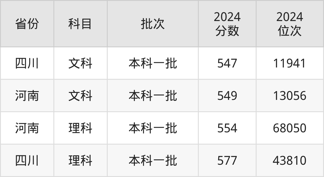 文科最低分对应地区为四川,录取位次为11941,超一本线18分;最高分对应地区为河南,录取位次为13056,超一本线28分。