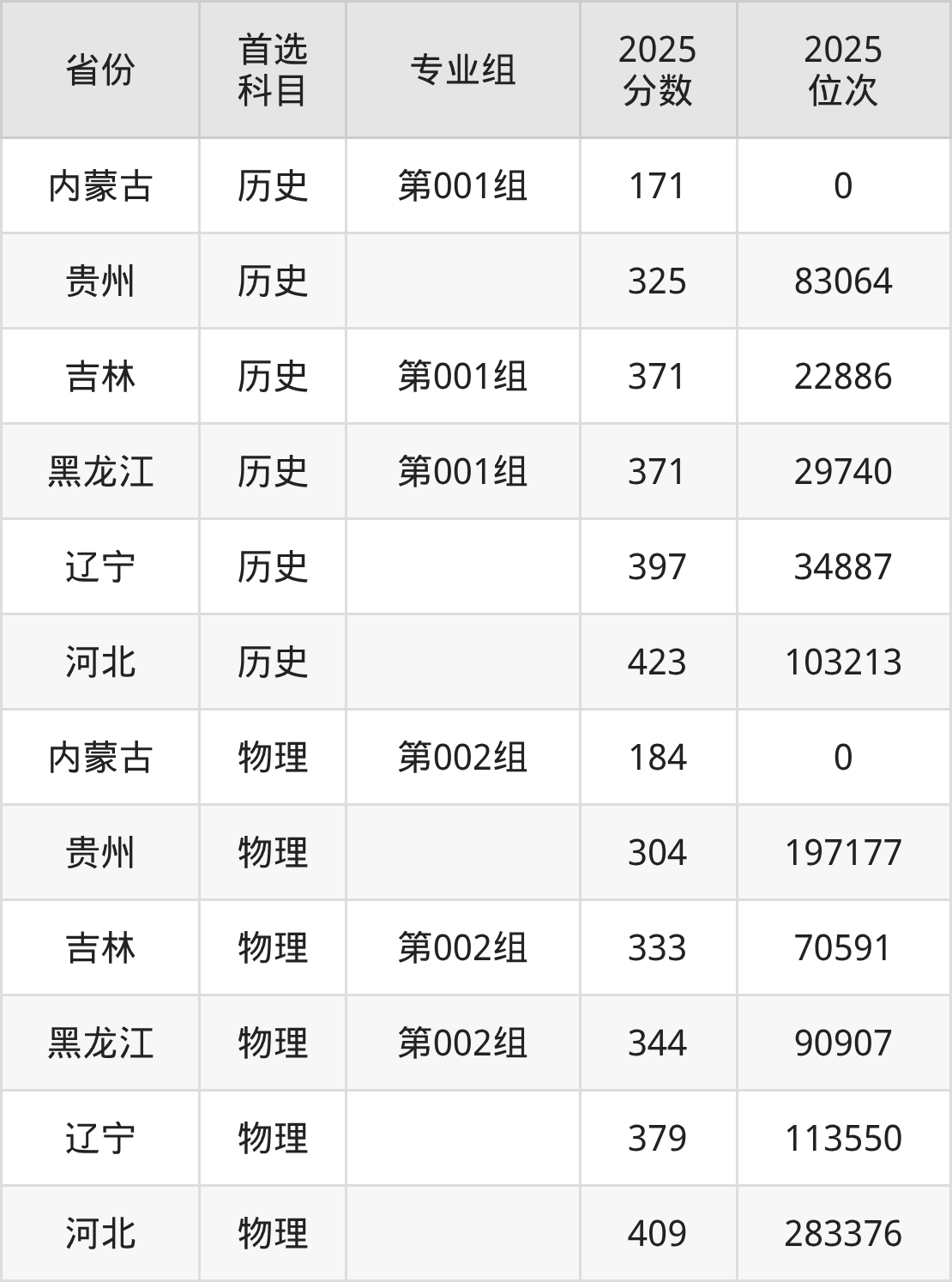 2025年通辽职业学院在新高考3+1+2地区的录取分数线为:历史类171分-423分、物理类184分-409分。