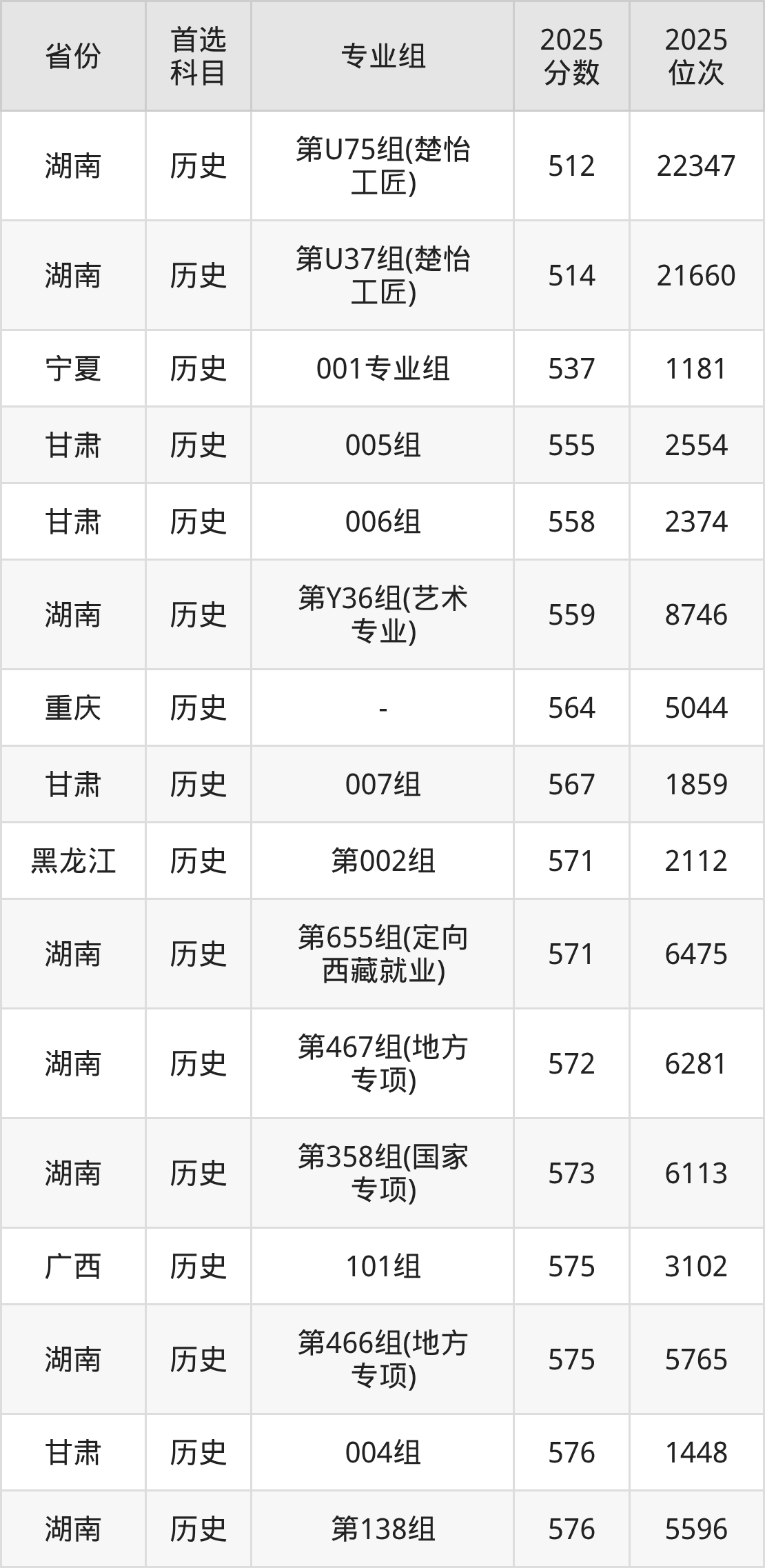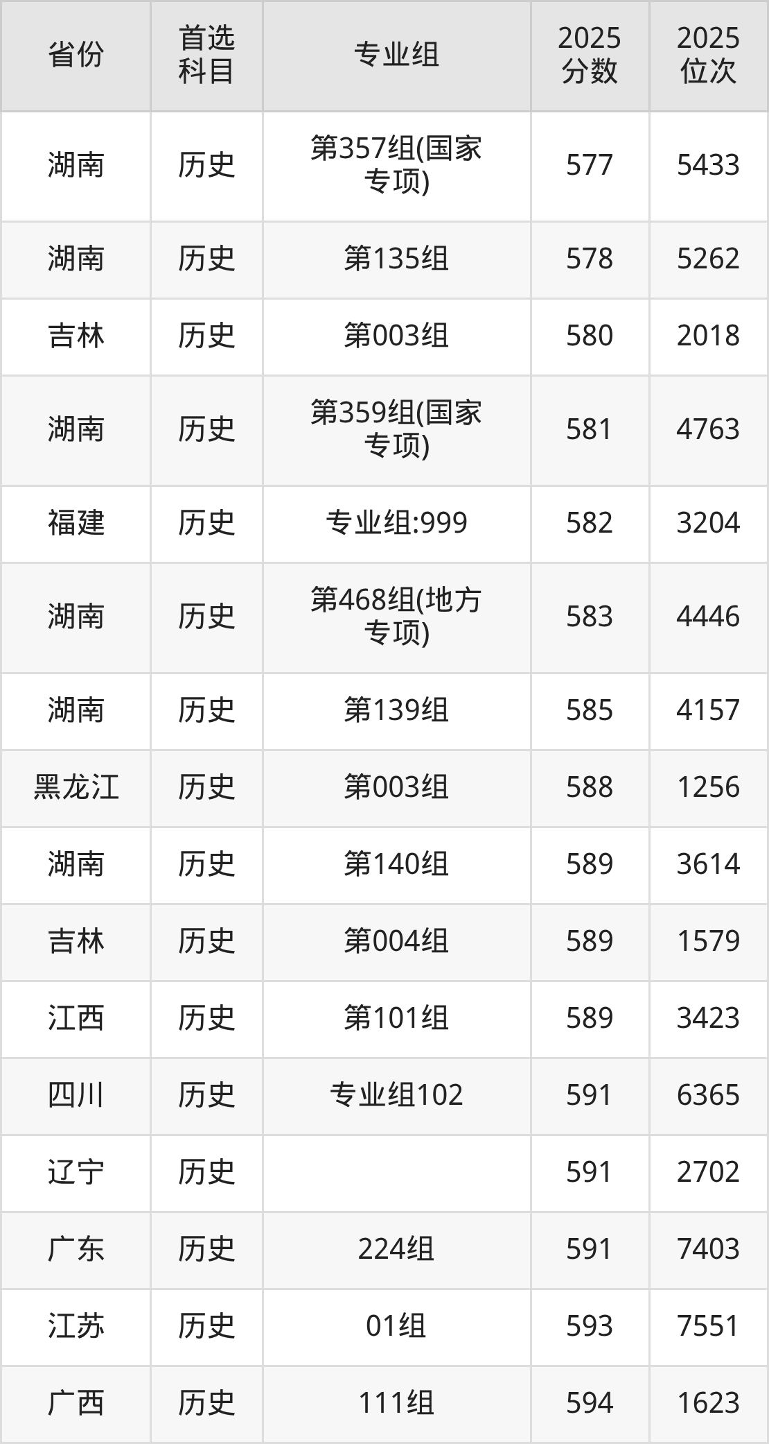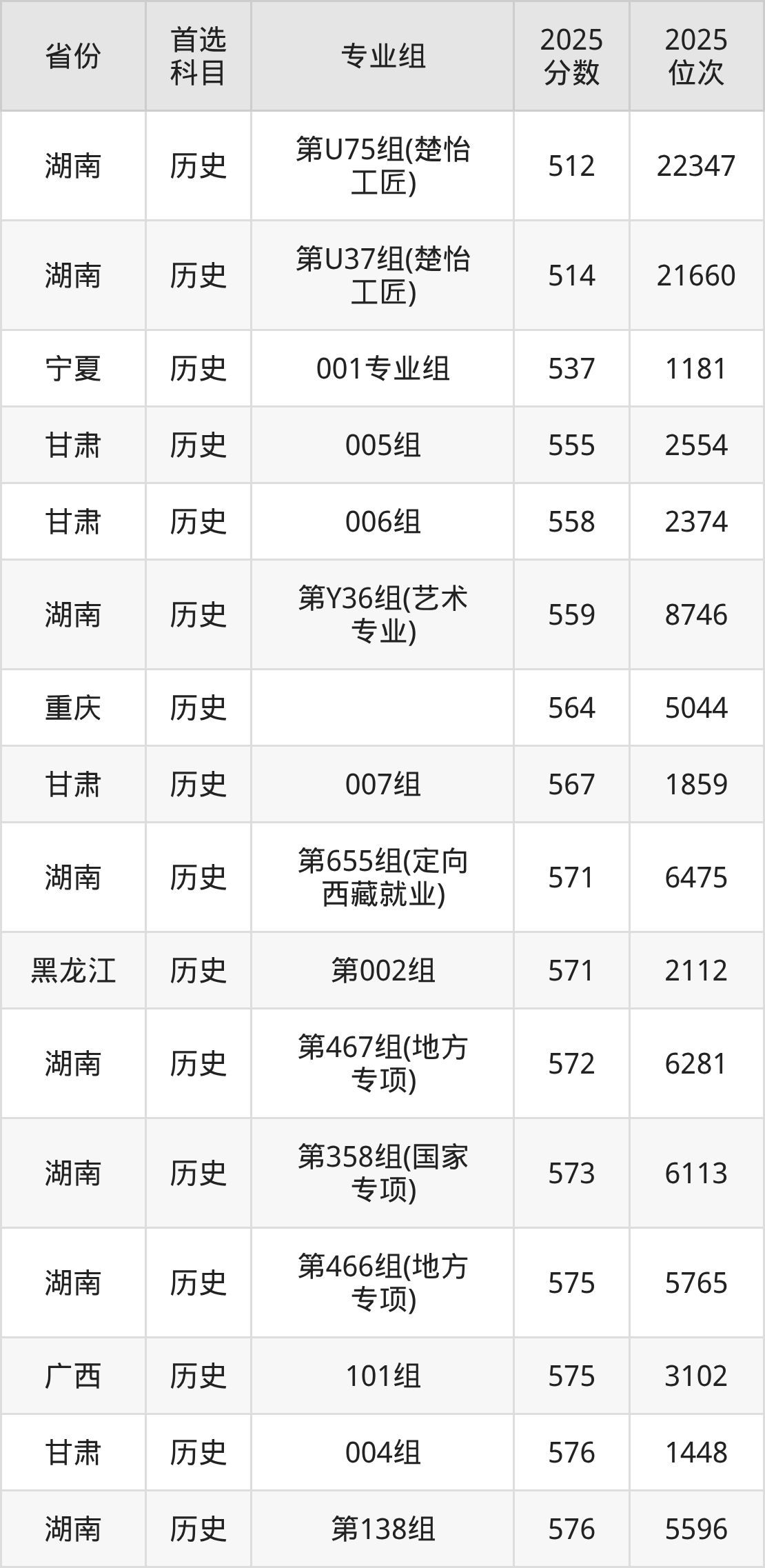 历史类:第147组575分、4859名,第150组567分、6033名,第151组586分、3392名,第152组590分、2942名,第354组(国家专项)571分、5446名,第355组(国家专项)551分、9086名,第356组(国家专项)582分、3914名,第457组(地方专项)576分、4717名,第458组(地方专项)564分、6595名,第459组(地方专项)581分、4051名,第653组(定向西藏就业)559分、7477名,第U49组(楚怡工匠)502分、23825名,第Y48组(艺术专业)517分、18421名;