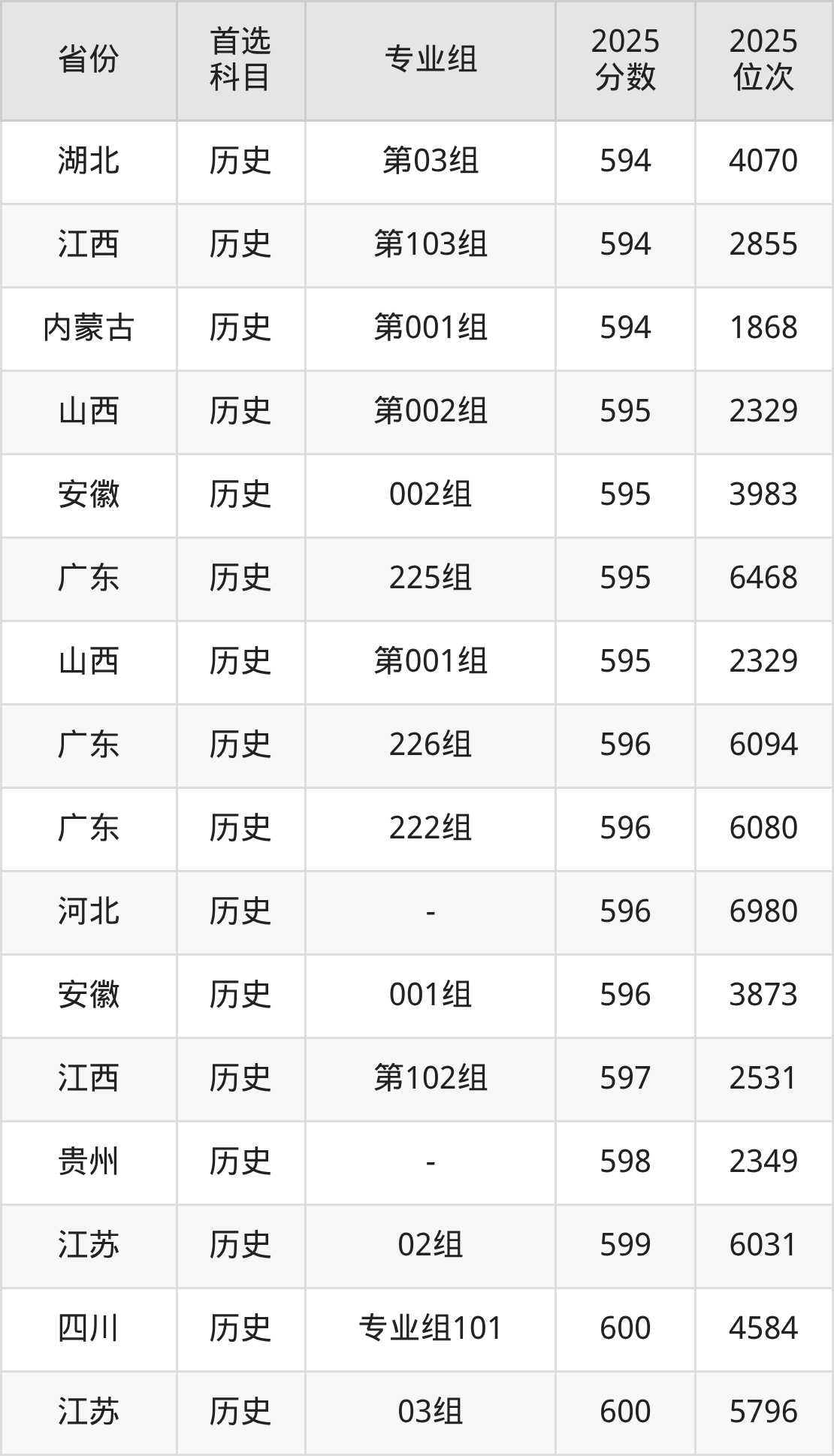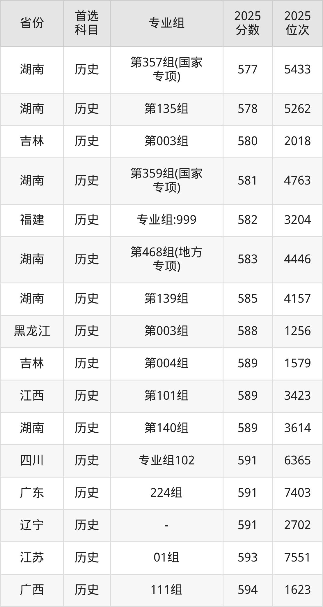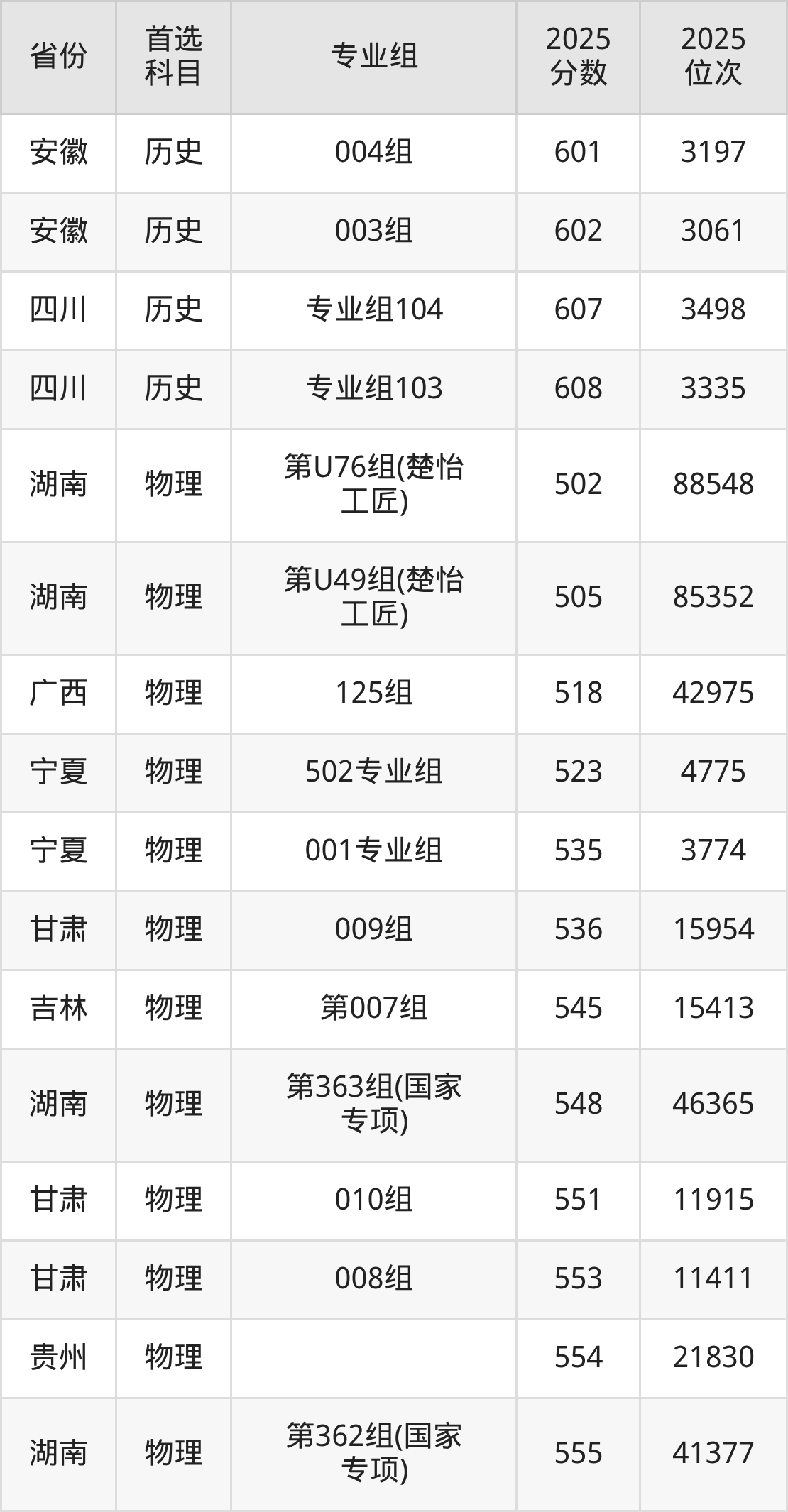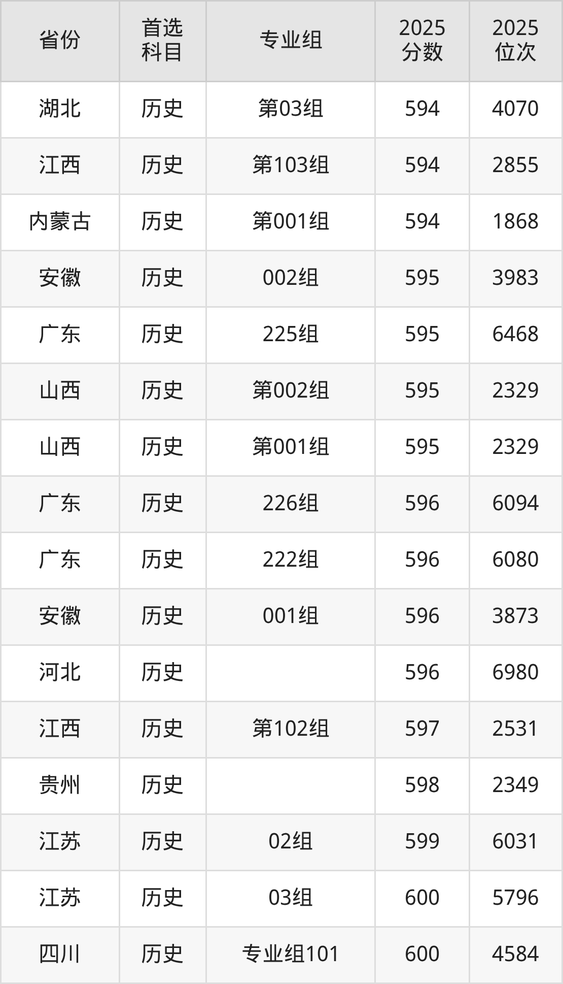 历史类:第147组575分、4859名,第150组567分、6033名,第151组586分、3392名,第152组590分、2942名,第354组(国家专项)571分、5446名,第355组(国家专项)551分、9086名,第356组(国家专项)582分、3914名,第457组(地方专项)576分、4717名,第458组(地方专项)564分、6595名,第459组(地方专项)581分、4051名,第653组(定向西藏就业)559分、7477名,第U49组(楚怡工匠)502分、23825名,第Y48组(艺术专业)517分、18421名;