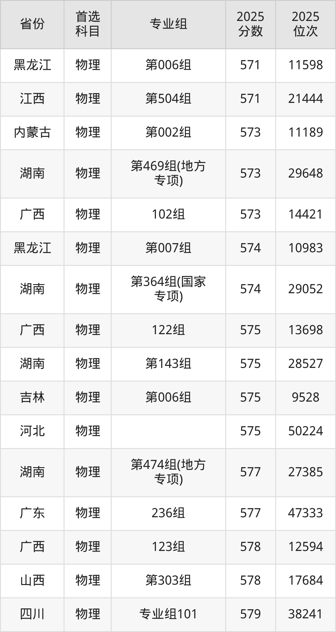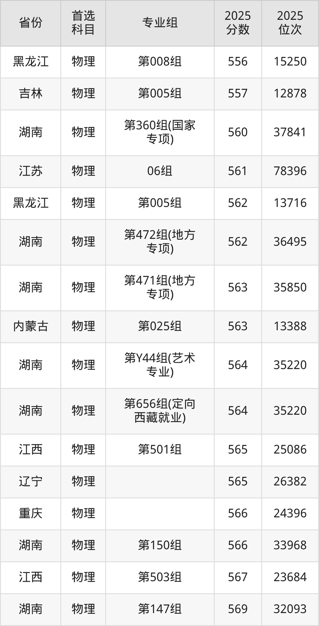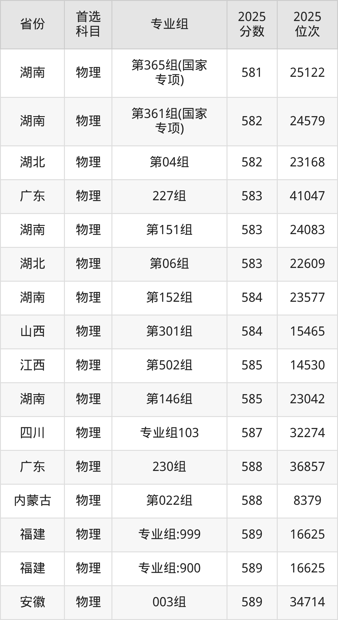 物理类:第162组575分、25681名,第164组587分、19611名,第165组595分、16203名,第166组581分、22516名,第168组576分、25138名,第169组601分、13821名,第170组584分、21009名,第372组(国家专项)570分、28408名,第373组(国家专项)581分、22516名,第374组(国家专项)564分、31944名,第375组(国家专项)555分、37811名,第376组(国家专项)582分、22012名,第477组(地方专项)572分、27280名,第478组(地方专项)588分、19164名,第479组(地方专项)565分、31312名,第480组(地方专项)561分、33880名,第481组(地方专项)584分、21009名,第671组(定向西藏就业)562分、33236名,第U67组(楚怡工匠)503分、84903名,第Y63组(艺术专业)567分、30156名;