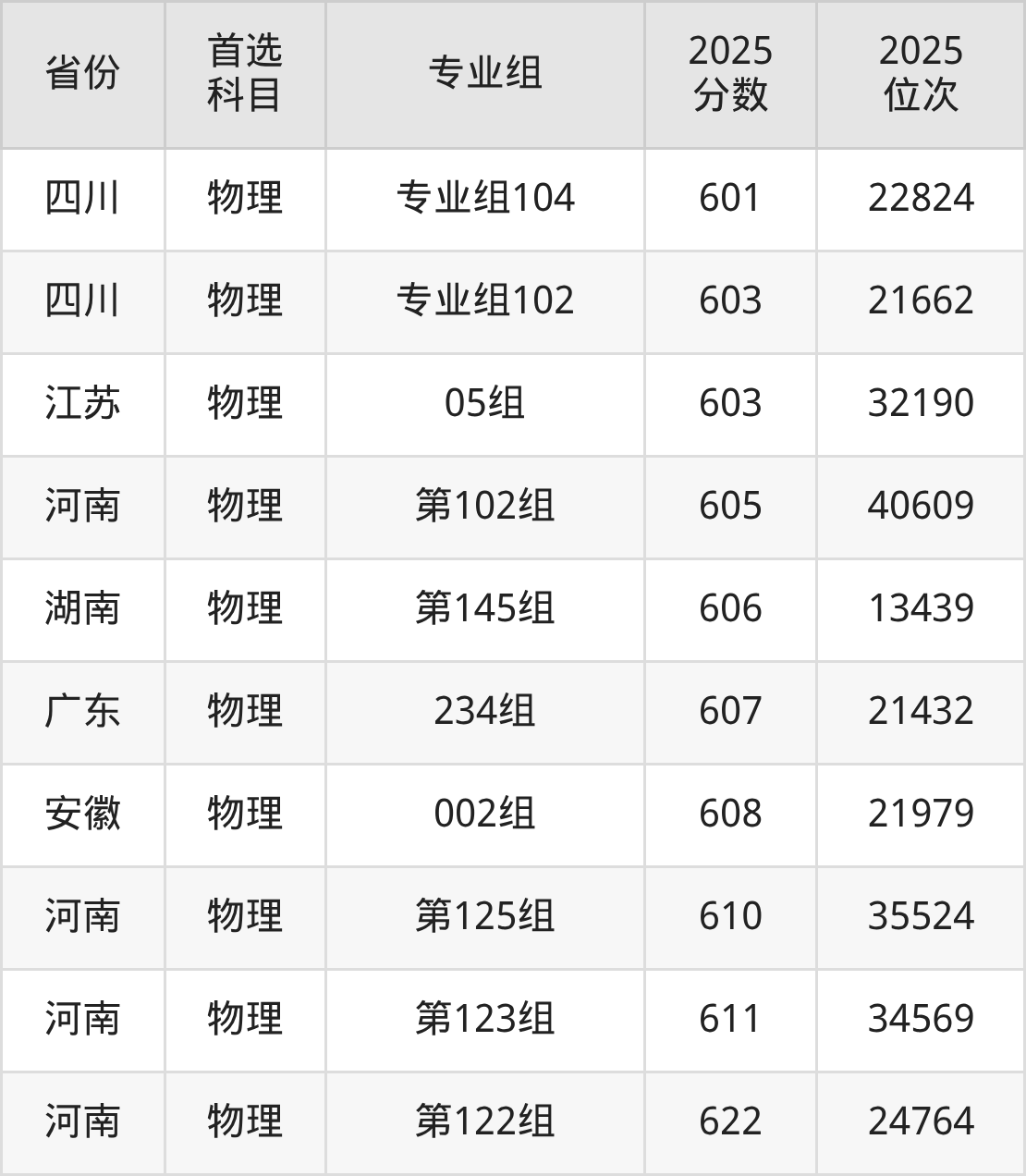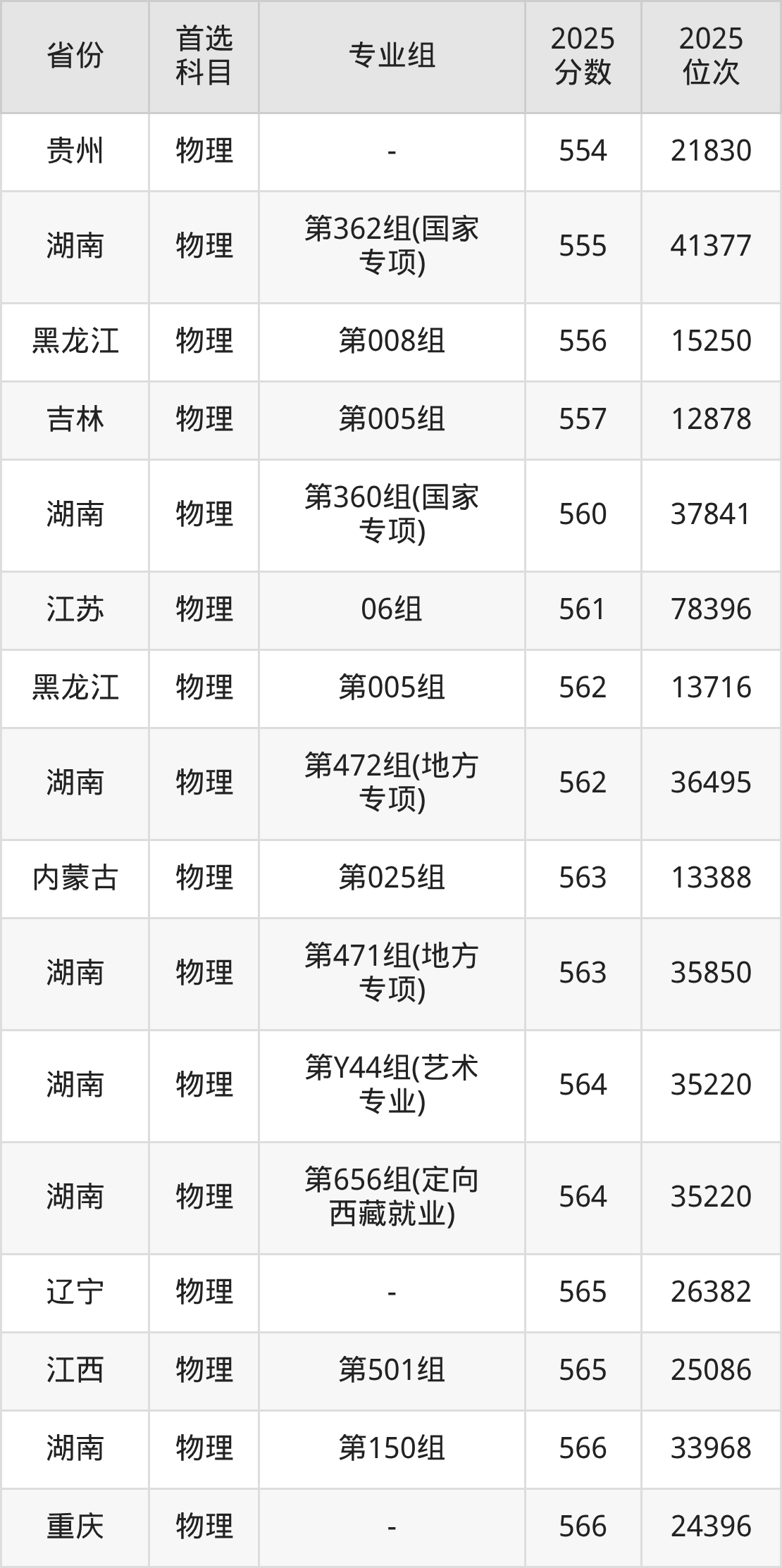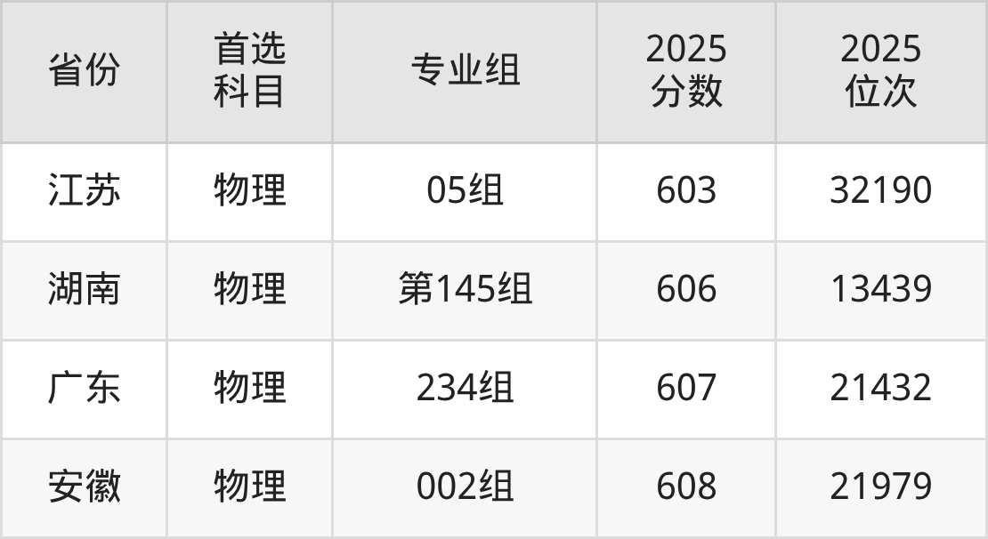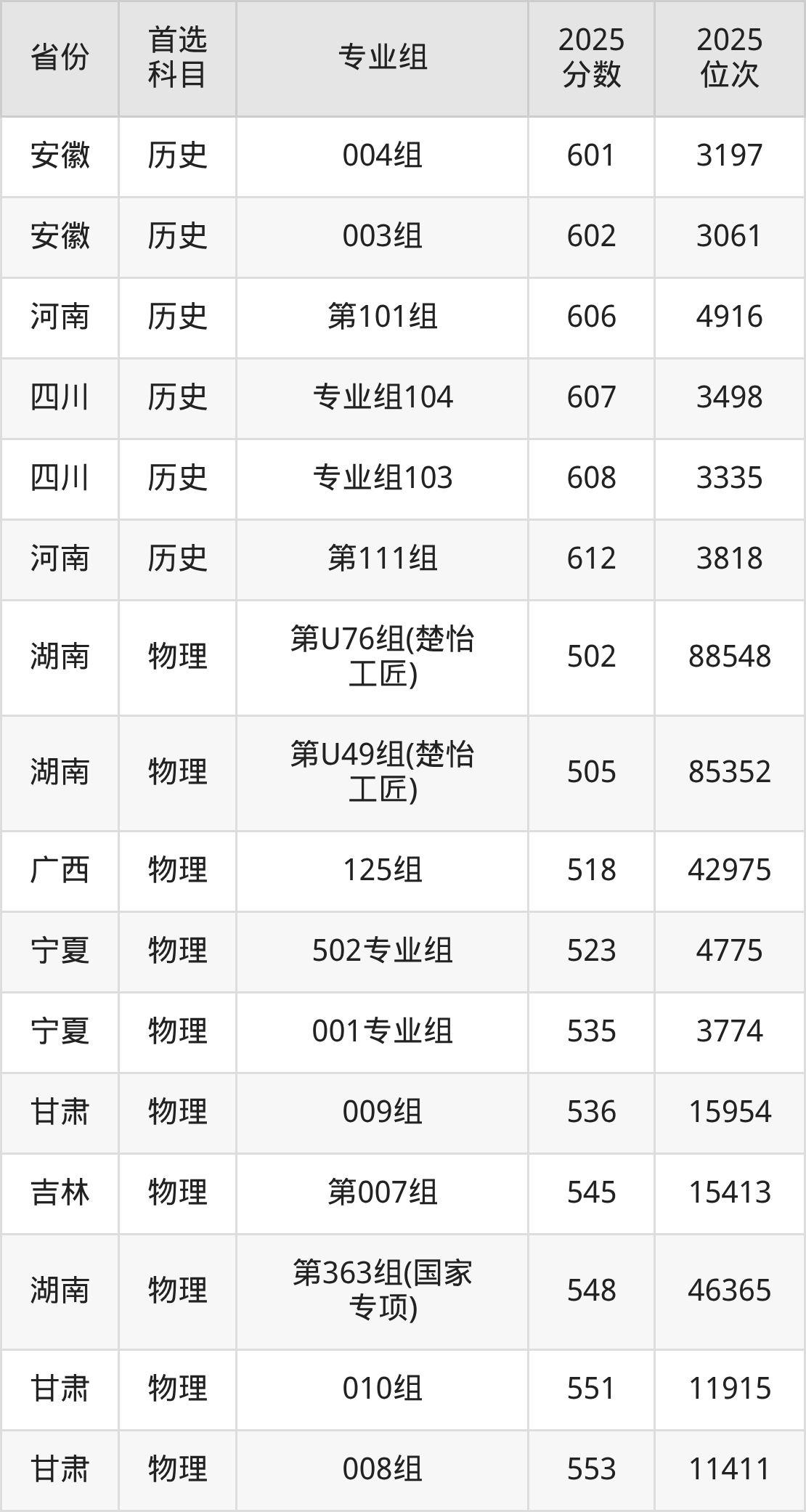 物理类:第162组575分、25681名,第164组587分、19611名,第165组595分、16203名,第166组581分、22516名,第168组576分、25138名,第169组601分、13821名,第170组584分、21009名,第372组(国家专项)570分、28408名,第373组(国家专项)581分、22516名,第374组(国家专项)564分、31944名,第375组(国家专项)555分、37811名,第376组(国家专项)582分、22012名,第477组(地方专项)572分、27280名,第478组(地方专项)588分、19164名,第479组(地方专项)565分、31312名,第480组(地方专项)561分、33880名,第481组(地方专项)584分、21009名,第671组(定向西藏就业)562分、33236名,第U67组(楚怡工匠)503分、84903名,第Y63组(艺术专业)567分、30156名;