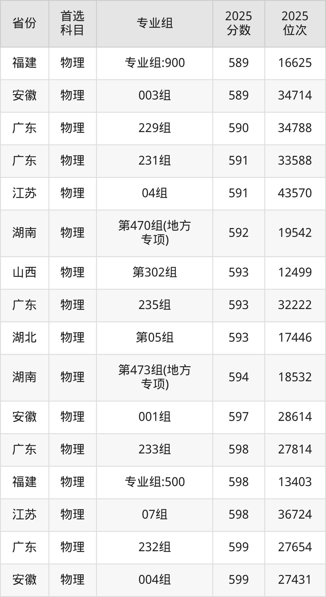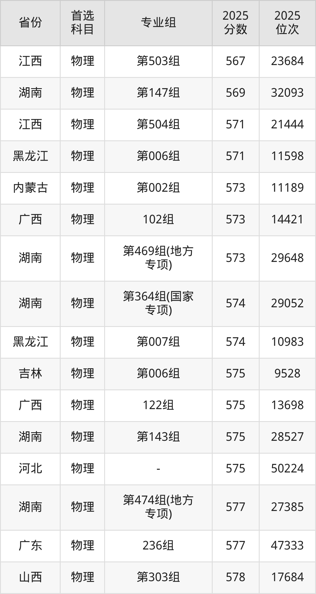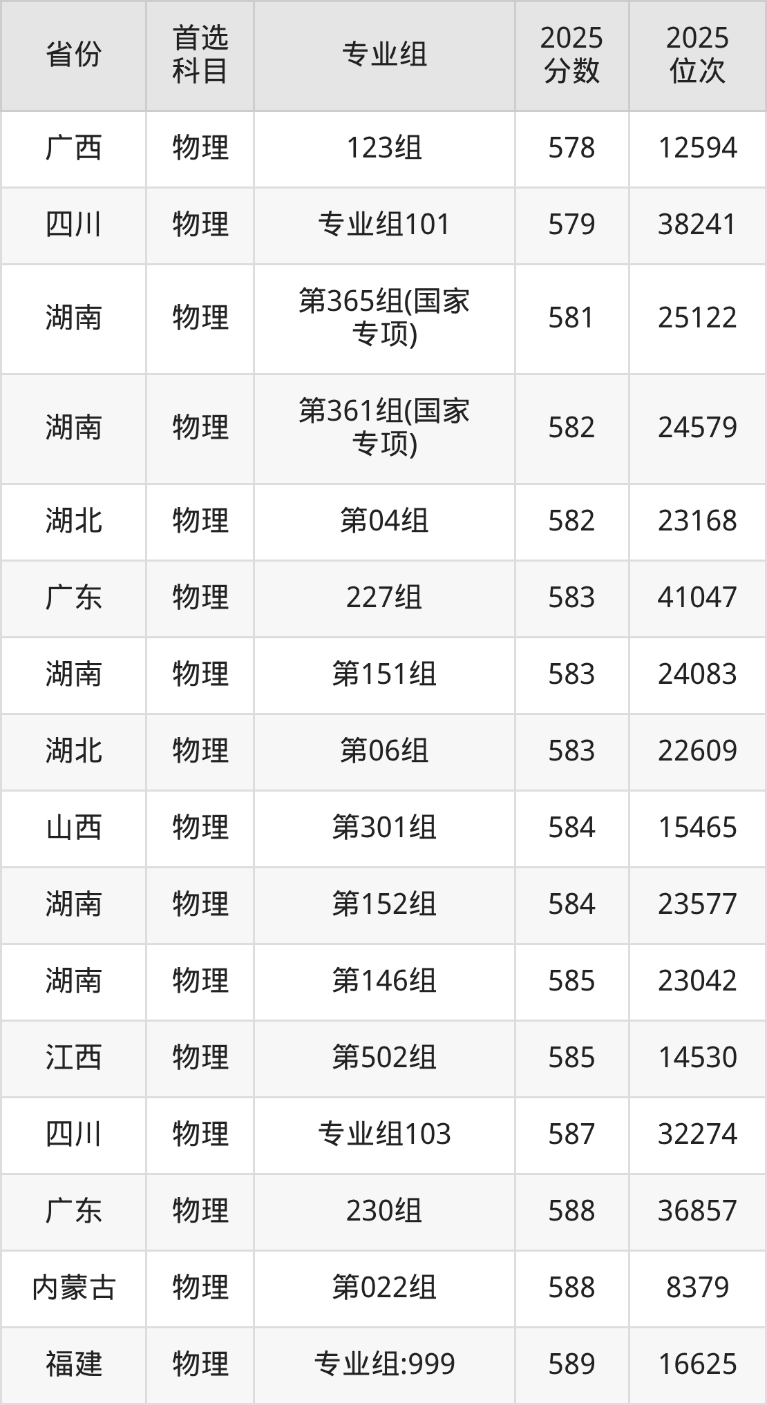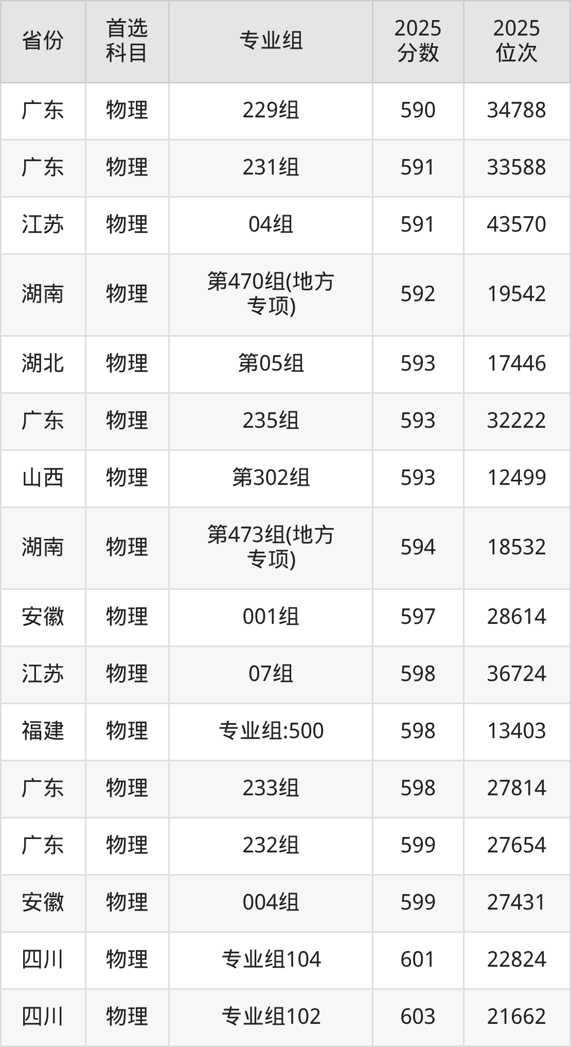 物理类:第121组584分、22037名,第122组583分、22539名,第123组601分、14748名,第124组598分、15926名,第125组585分、21577名,第126组591分、18878名,第127组587分、20665名,第128组597分、16325名,第338组(国家专项)584分、22037名,第339组(国家专项)549分、42191名,第340组(国家专项)596分、16787名,第341组(国家专项)562分、33984名,第342组(国家专项)577分、25516名,第343组(国家专项)573分、27663名,第344组(国家专项)584分、22037名,第449组(地方专项)587分、20665名,第450组(地方专项)568分、30454名,第451组(地方专项)602分、14370名,第452组(地方专项)569分、29931名,第453组(地方专项)584分、22037名,第454组(地方专项)575分、26620名,第455组(地方专项)587分、20665名,第632组(定向西藏就业)560分、35166名,第633组(定向西藏就业)583分、22539名。