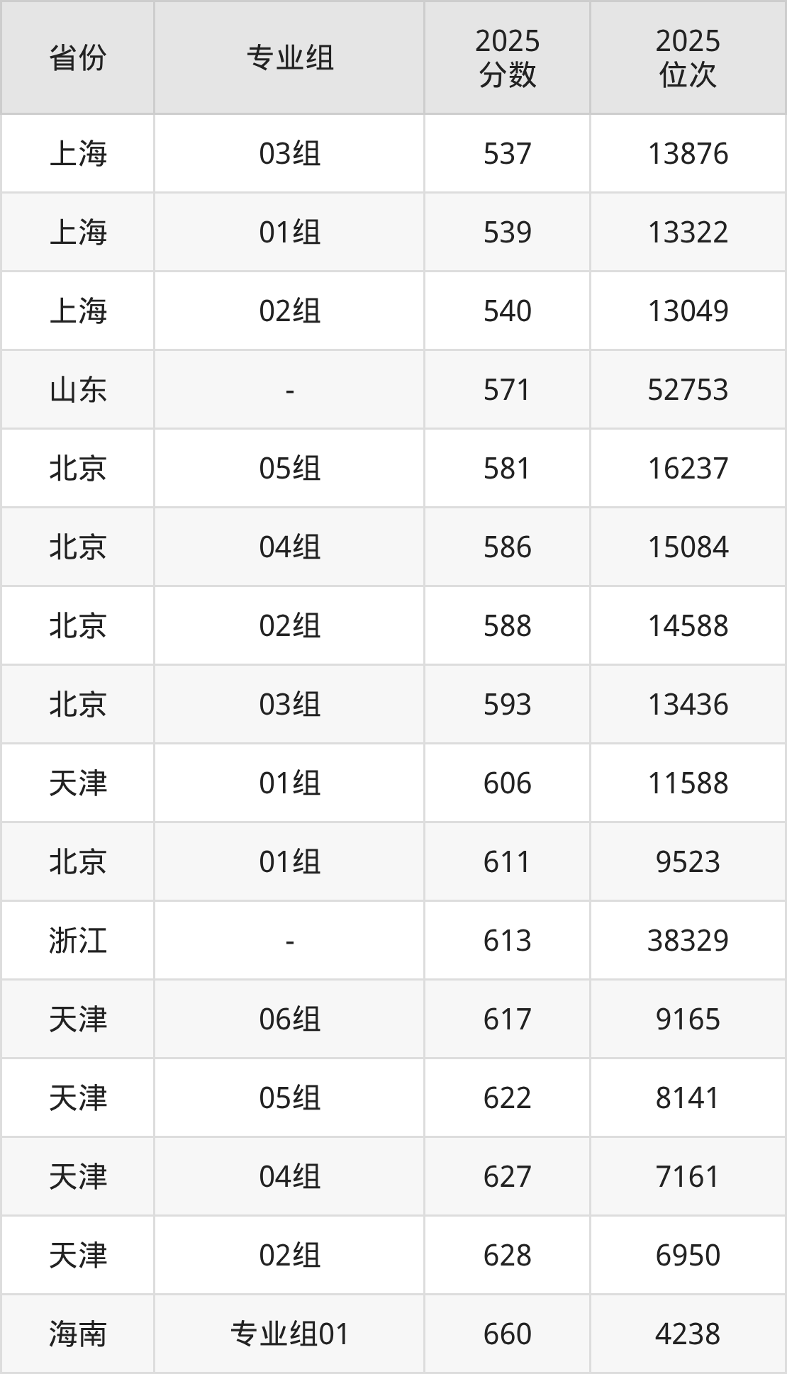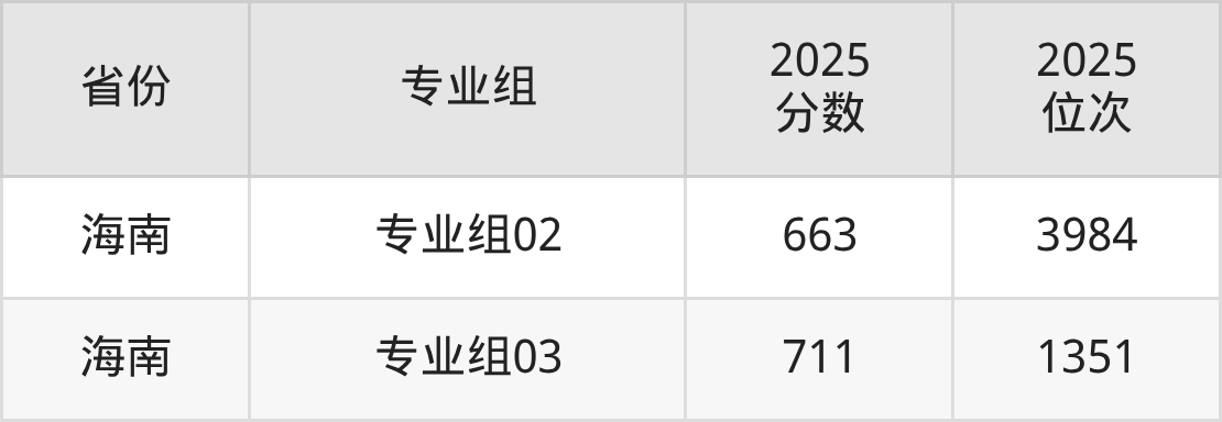 最低分对应地区为上海(03组),录取位次为13876,超本科线135分;最高分对应地区为海南(专业组03),录取位次为1351,超本科线231分。