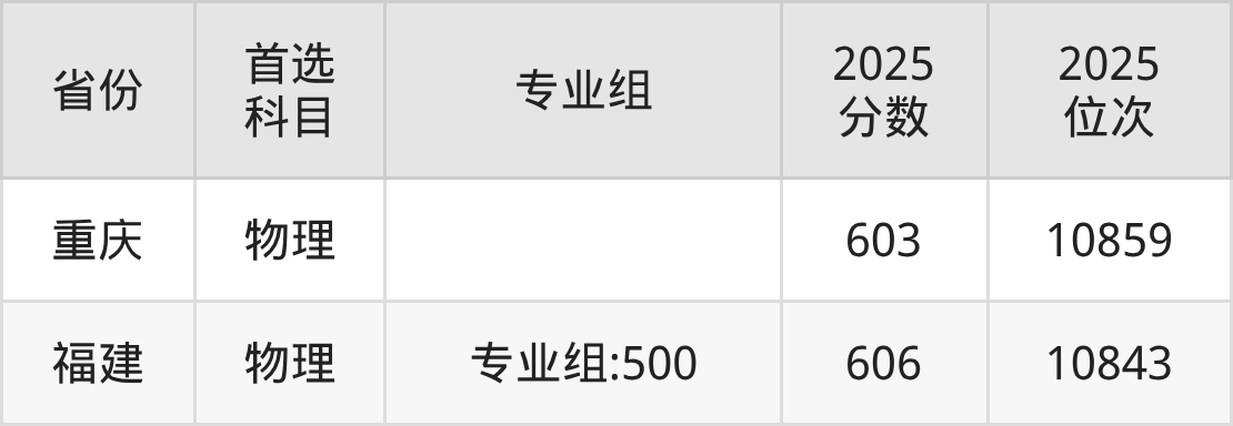 物理类最低分对应地区为重庆,录取位次为10859,超本科线178分;最高分对应地区为福建(专业组:500),录取位次为10843,超本科线165分。