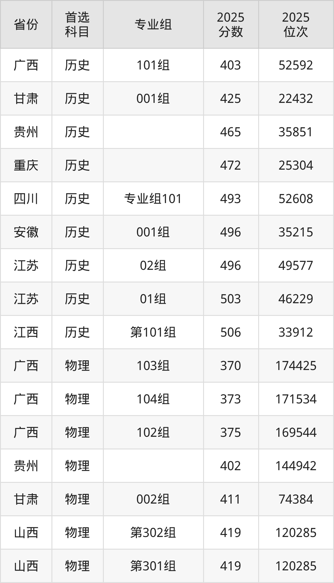 历史类最低分对应地区为广西(101组),录取位次为52592,超本科线1分;最高分对应地区为江西(第101组),录取位次为33912。