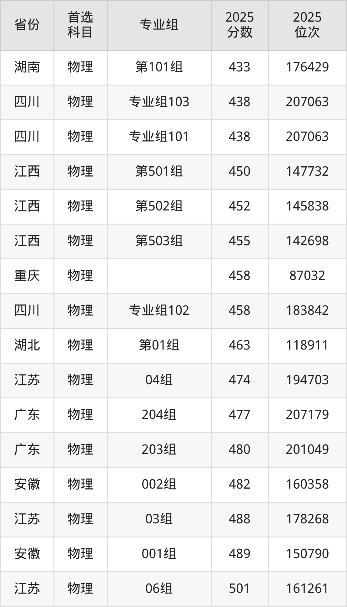物理类最低分对应地区为广西(103组),录取位次为174425;最高分对应地区为江苏(05组),录取位次为106680,超本科线77分。