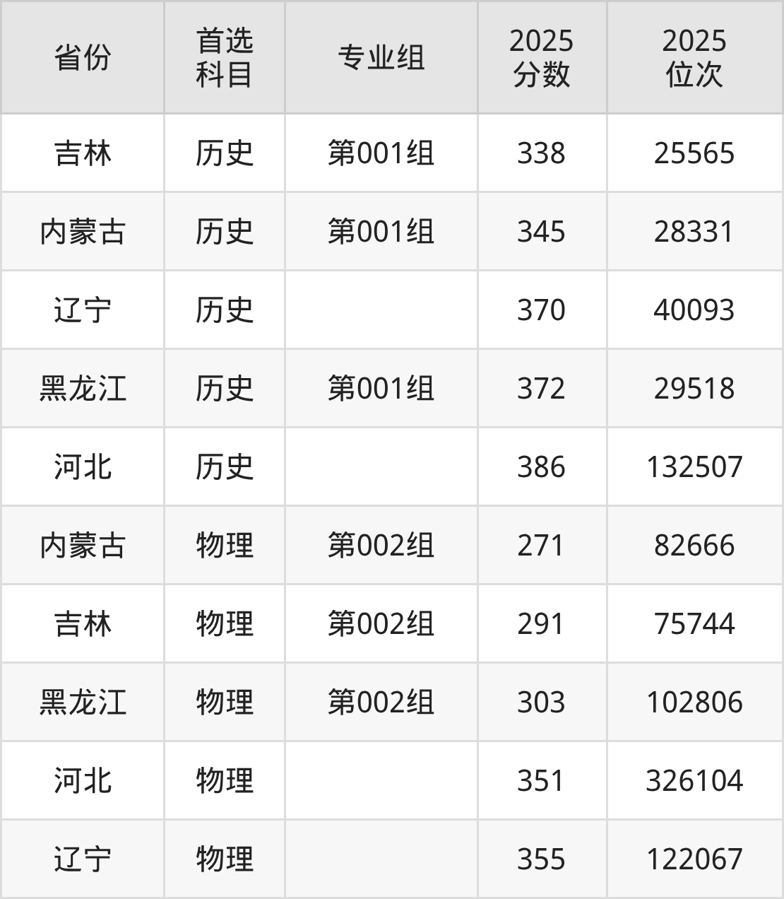 物理类最低分对应地区为内蒙古(第002组),录取位次为82666,超专科线111分;最高分对应地区为辽宁,录取位次为122067,超专科线205分。