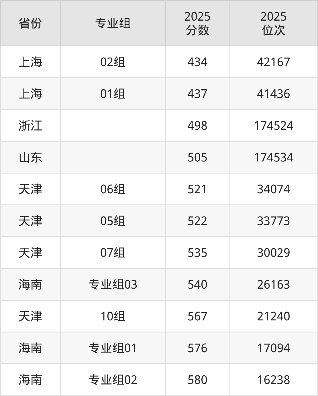 最低分对应地区为上海(02组),录取位次为42167,超本科线32分;最高分对应地区为海南(专业组02),录取位次为16238。