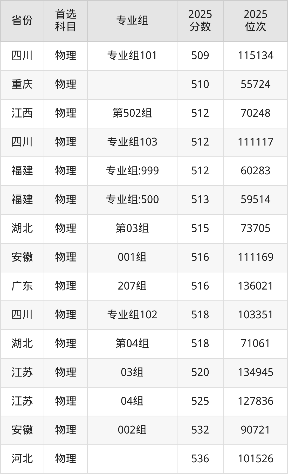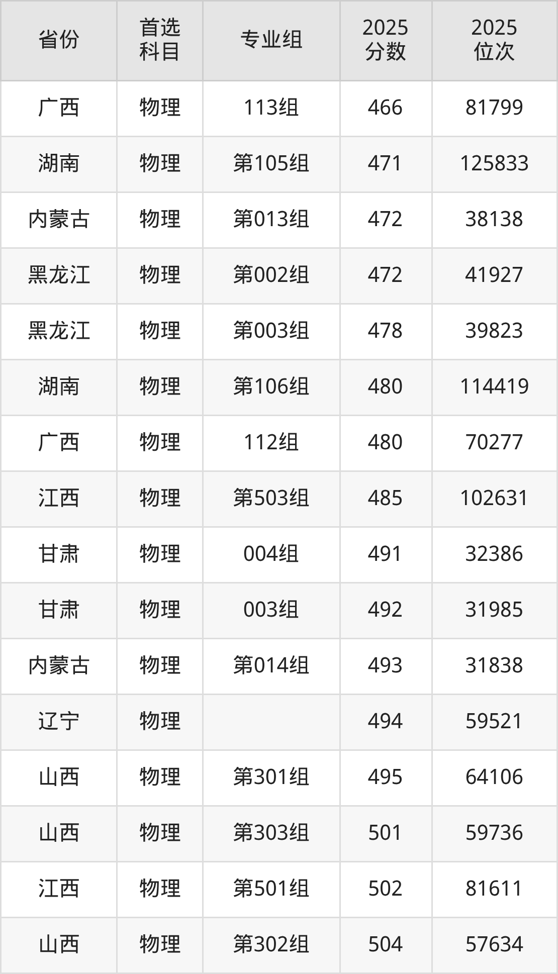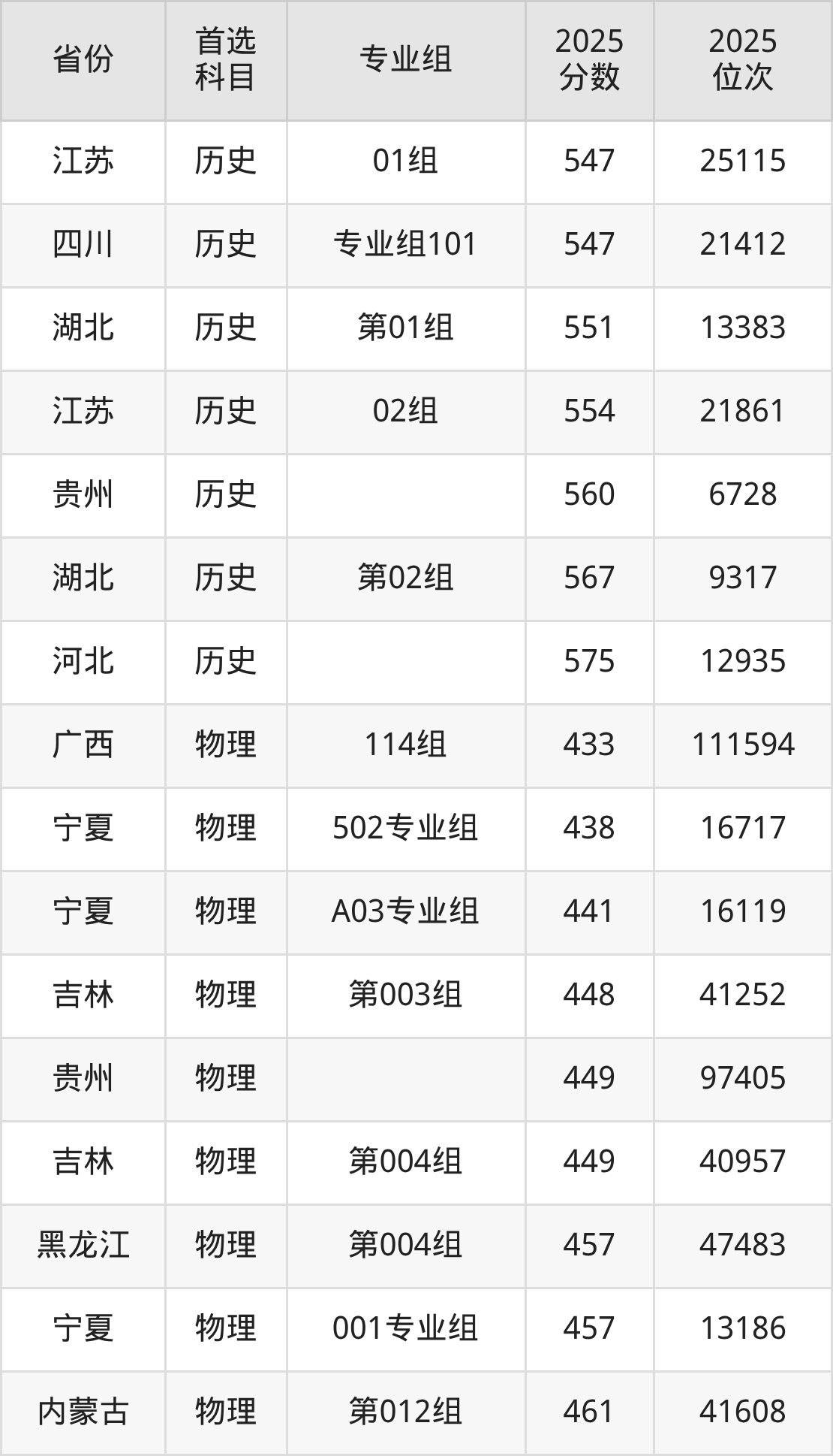 物理类最低分对应地区为广西(114组),录取位次为111594,超本科线63分;最高分对应地区为河北,录取位次为101526,超本科线77分。