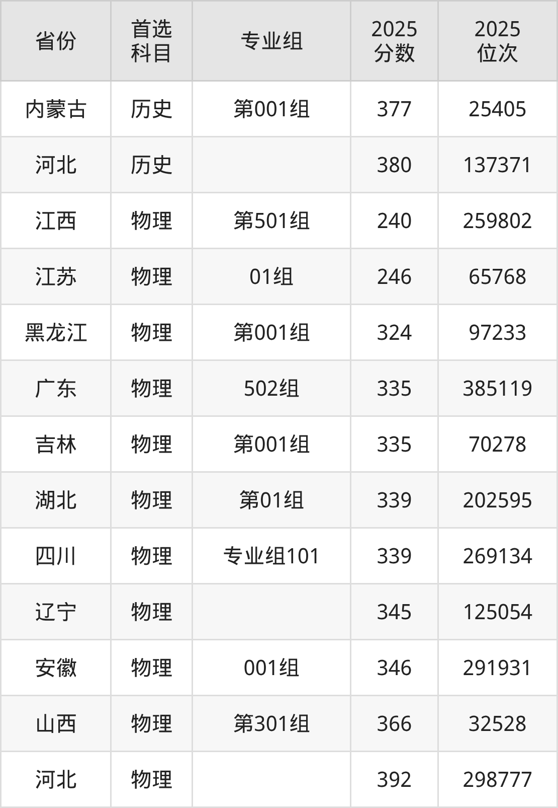 历史类最低分对应地区为内蒙古(第001组),录取位次为25405,超专科线217分;最高分对应地区为河北,录取位次为137371。