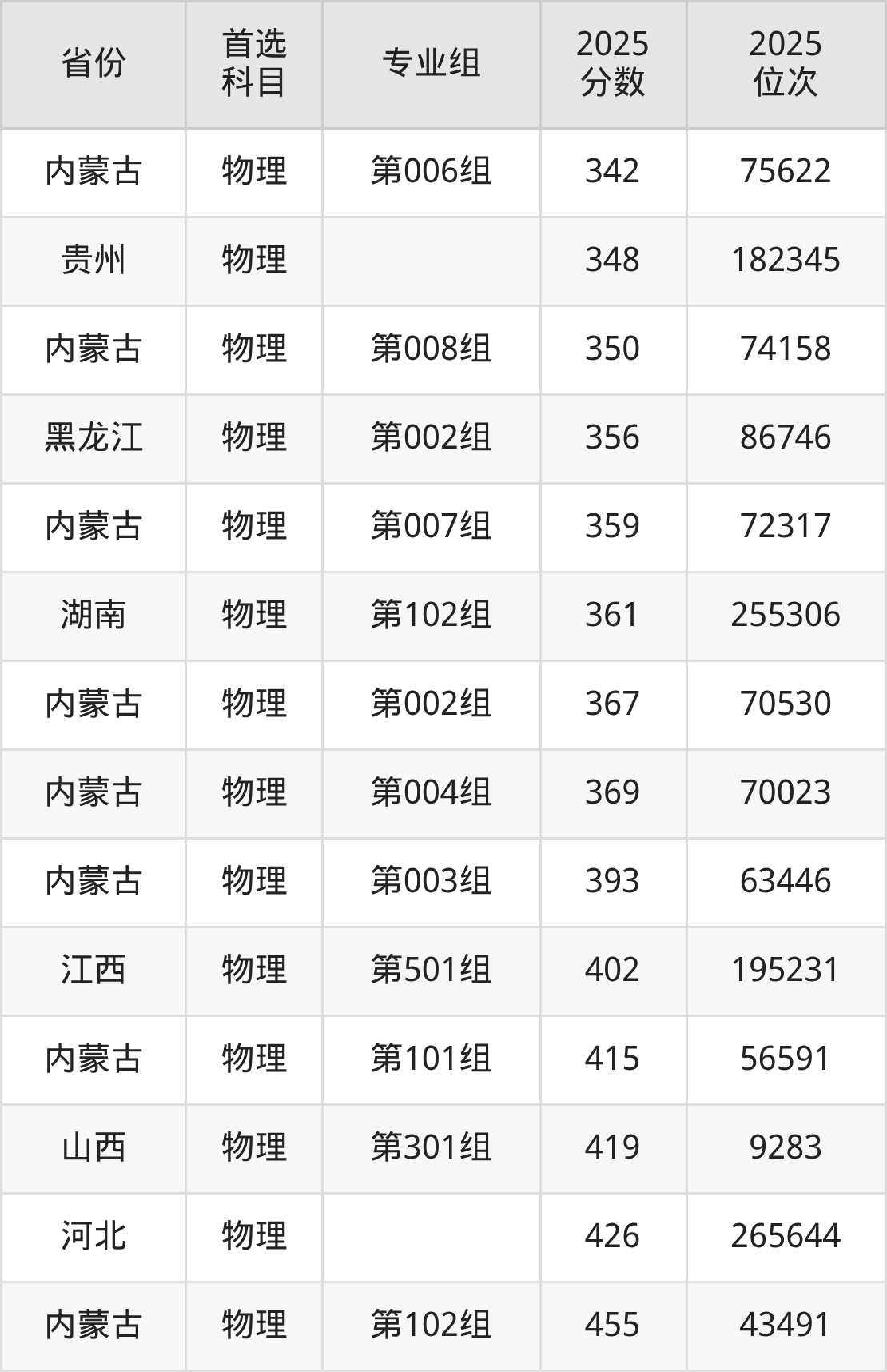 物理类:第001组340分、76001名,第002组367分、70530名,第003组393分、63446名,第004组369分、70023名,第005组338分、76331名,第006组342分、75622名,第007组359分、72317名,第008组350分、74158名,第101组415分、56591名,第102组455分、43491名;