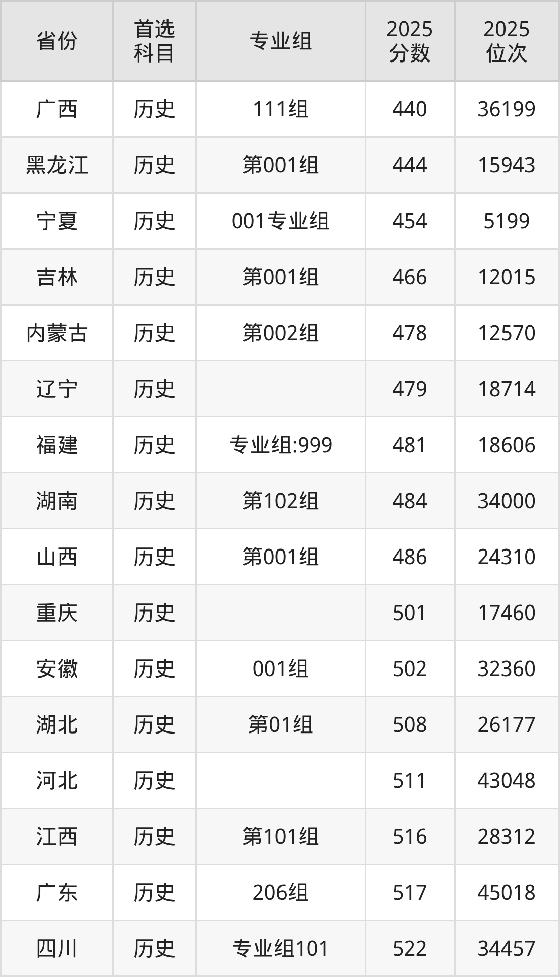 历史类最低分对应地区为广西(111组),录取位次为36199,超本科线38分;最高分对应地区为江苏(01组),录取位次为35055,超本科线44分。