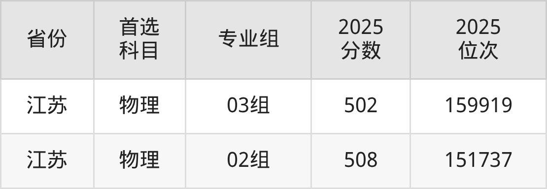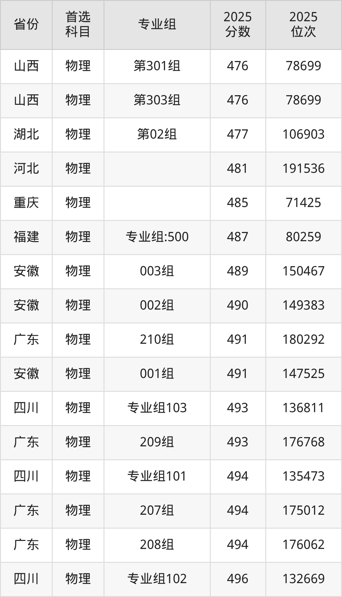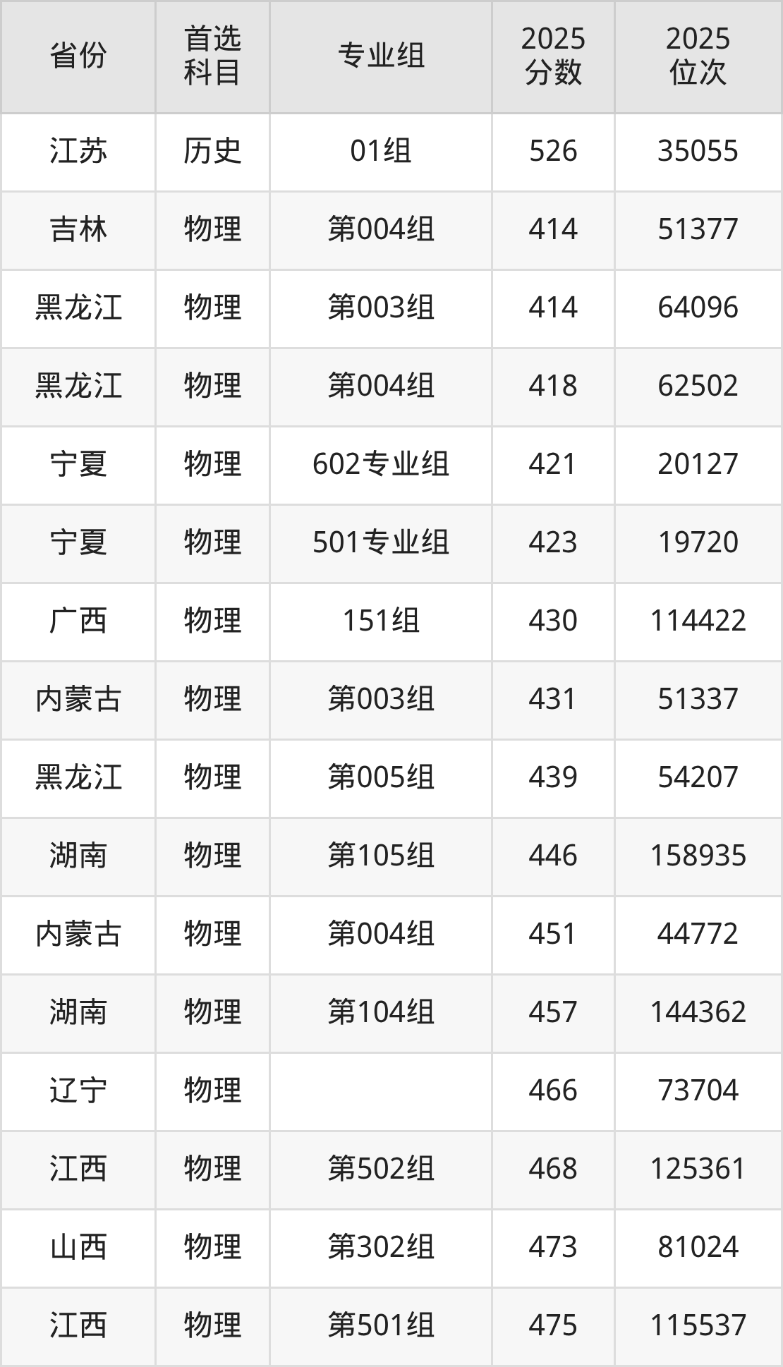 物理类最低分对应地区为吉林(第004组),录取位次为51377,超本科线74分;最高分对应地区为江苏(02组),录取位次为151737,超本科线45分。