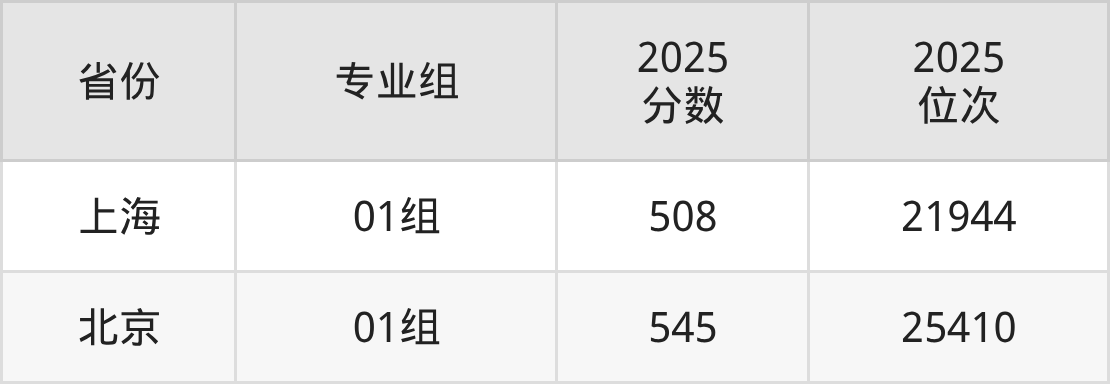 最低分对应地区为上海(01组),录取位次为21944,超本科线106分;最高分对应地区为北京(01组),录取位次为25410,超本科线115分。