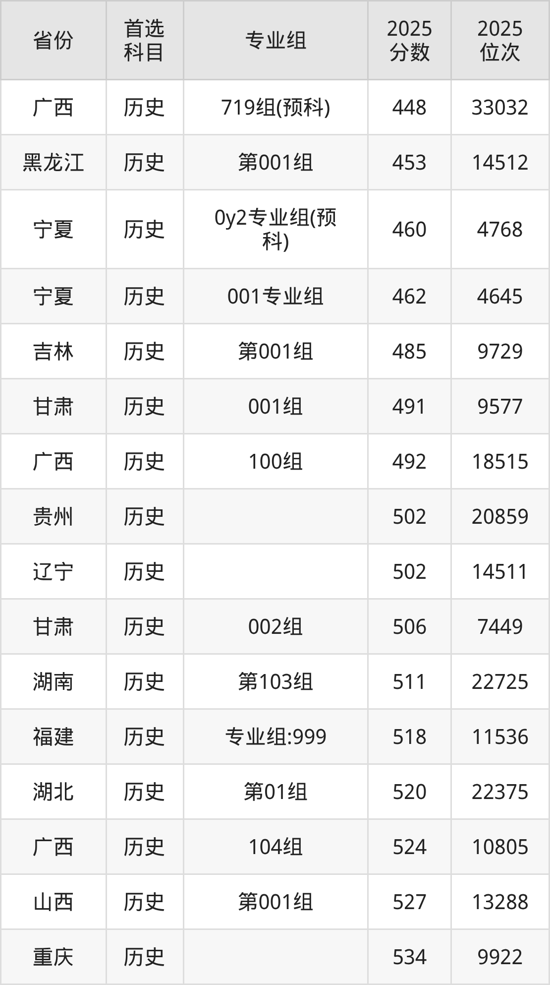 历史类最低分对应地区为广西(719组(预科)),录取位次为33032,超本科线46分;最高分对应地区为安徽(001组),录取位次为12013。