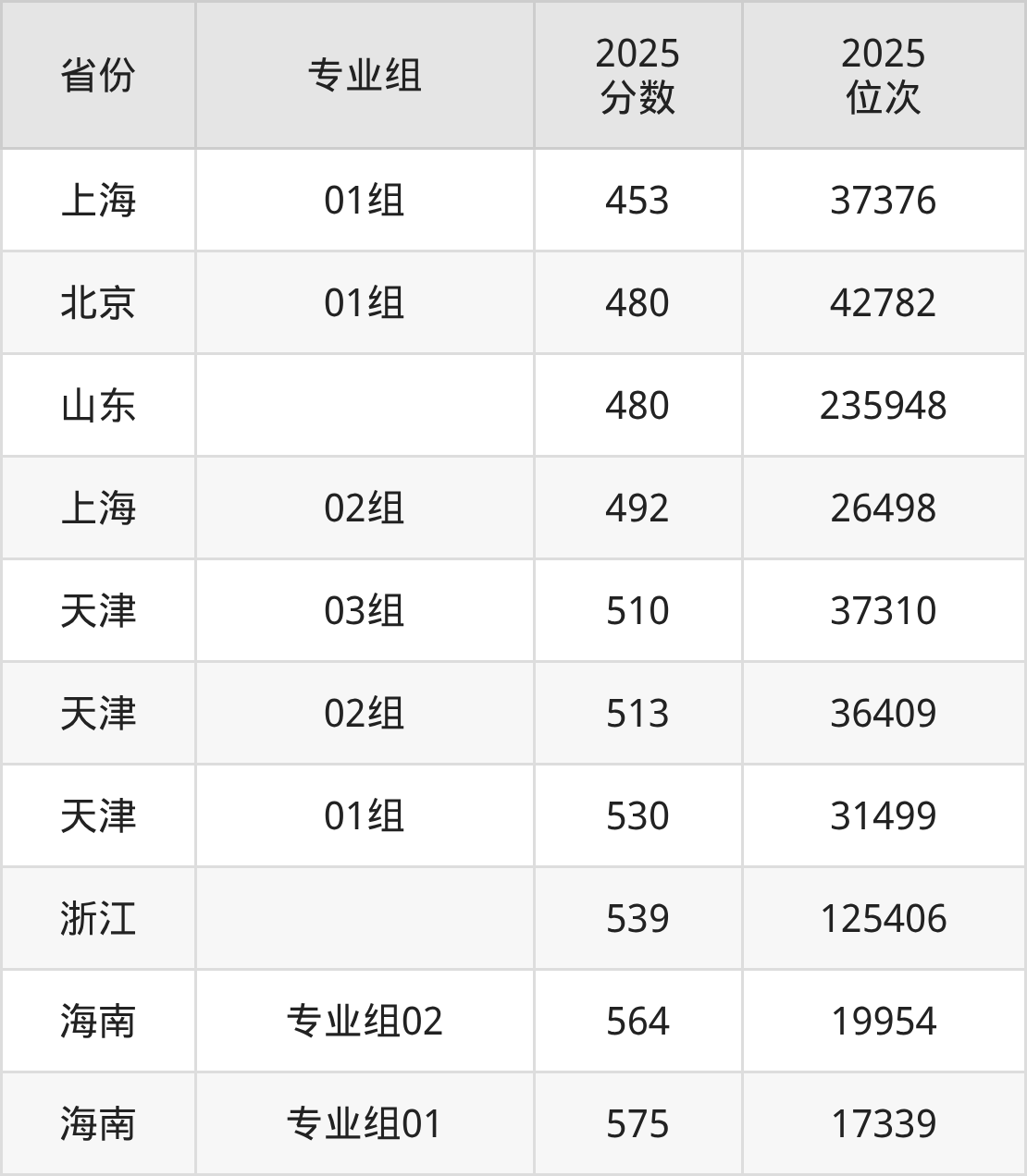 最低分对应地区为上海(01组),录取位次为37376,超本科线51分;最高分对应地区为海南(专业组01),录取位次为17339,超本科线95分。