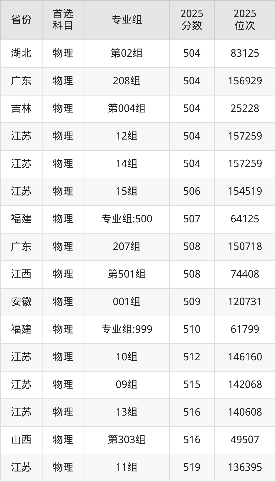 物理类:09组515分、142068名,10组512分、146160名,11组519分、136395名,12组504分、157259名,13组516分、140608名,14组504分、157259名,15组506分、154519名,16组542分、103949名,17组522分、132082名;
