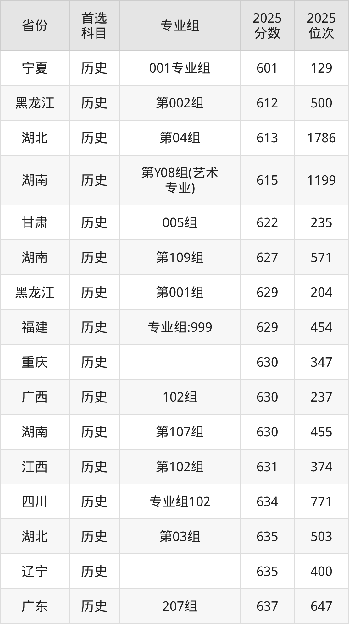 历史类最低分对应地区为宁夏(001专业组),录取位次为129,超本科B197分;最高分对应地区为河北,录取位次为512。