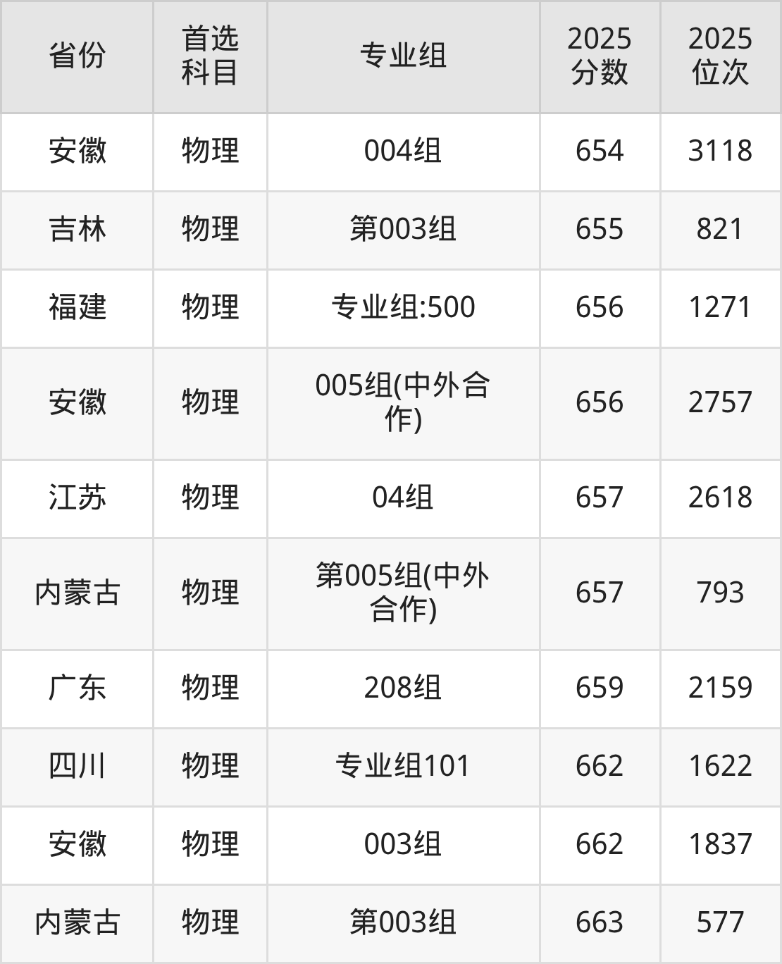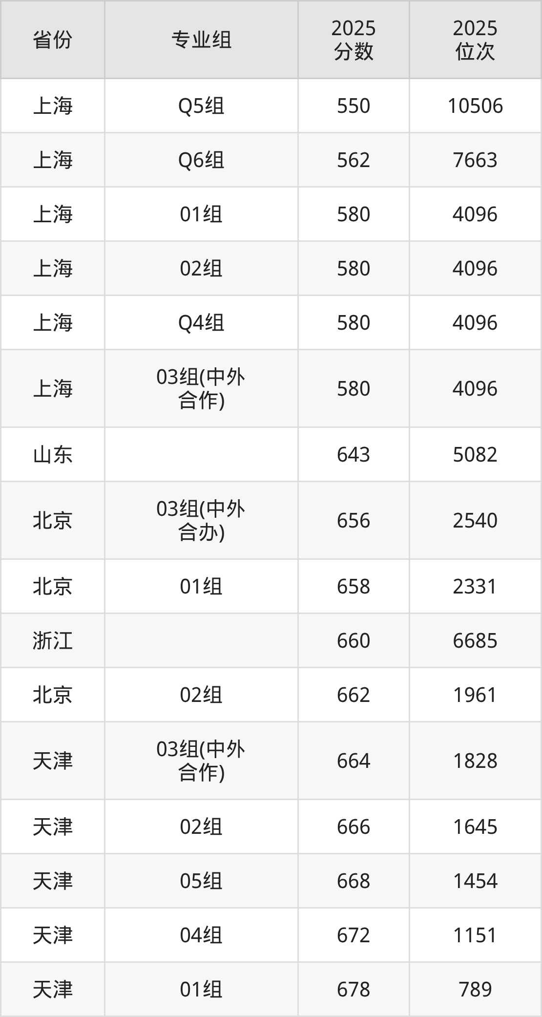 01组580分、4096名,02组580分、4096名,03组(中外合作)580分、4096名,Q4组580分、4096名,Q5组550分、10506名,Q6组562分、7663名;