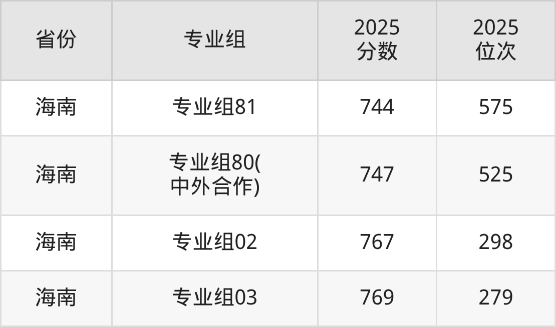 最低分对应地区为上海(Q5组),录取位次为10506,超本科线148分;最高分对应地区为海南(专业组03),录取位次为279,超本科线289分。