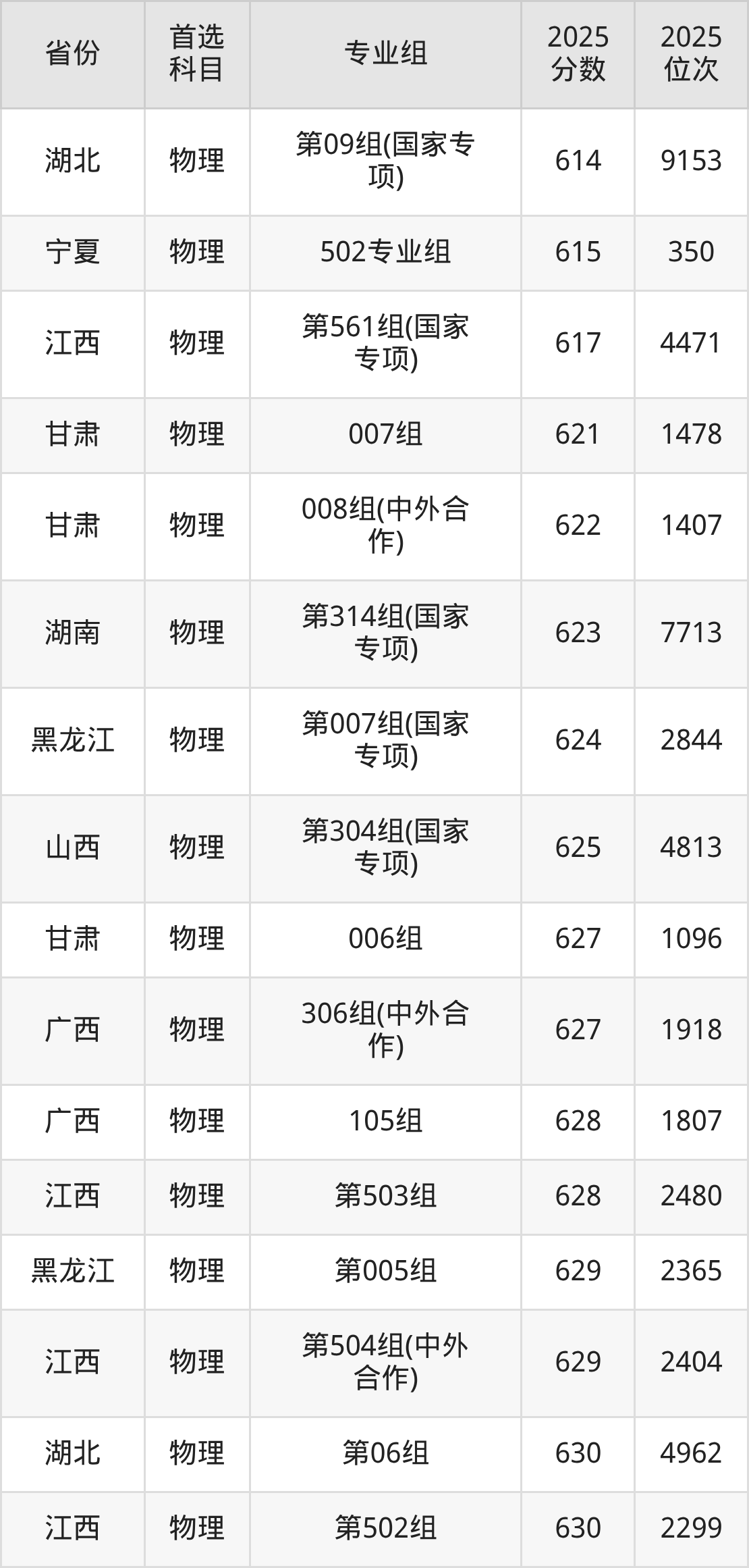 物理类最低分对应地区为宁夏(5A4专业组(国家专项)),录取位次为2608;最高分对应地区为内蒙古(第003组),录取位次为577,超本科线288分。