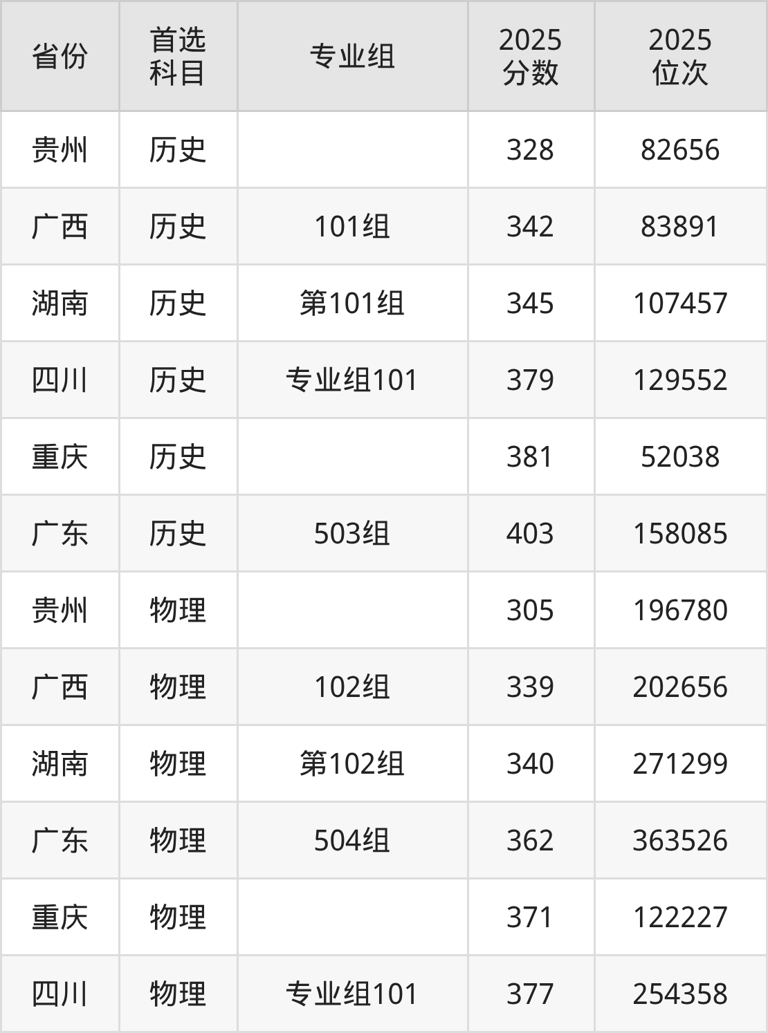 历史类最低分对应地区为贵州,录取位次为82656,超专科线148分;最高分对应地区为广东(503组),录取位次为158085,超专科线188分。