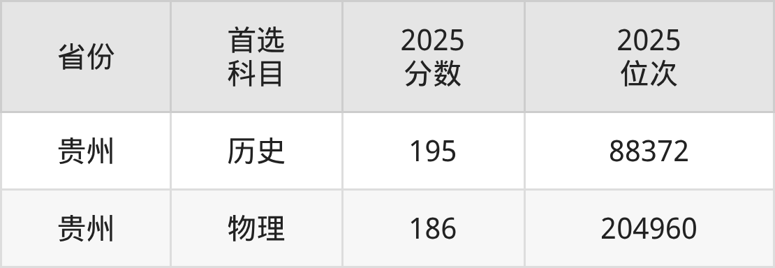 物理类最低分对应地区为贵州,录取位次为204960,超专科线6分。