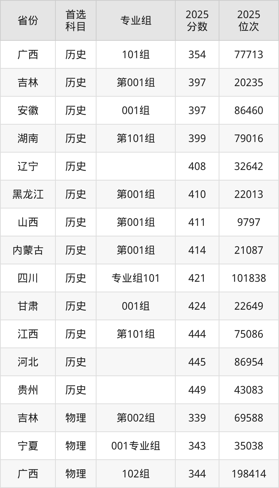 历史类最低分对应地区为广西(101组),录取位次为77713,超专科线154分;最高分对应地区为贵州,录取位次为43083,超专科线269分。