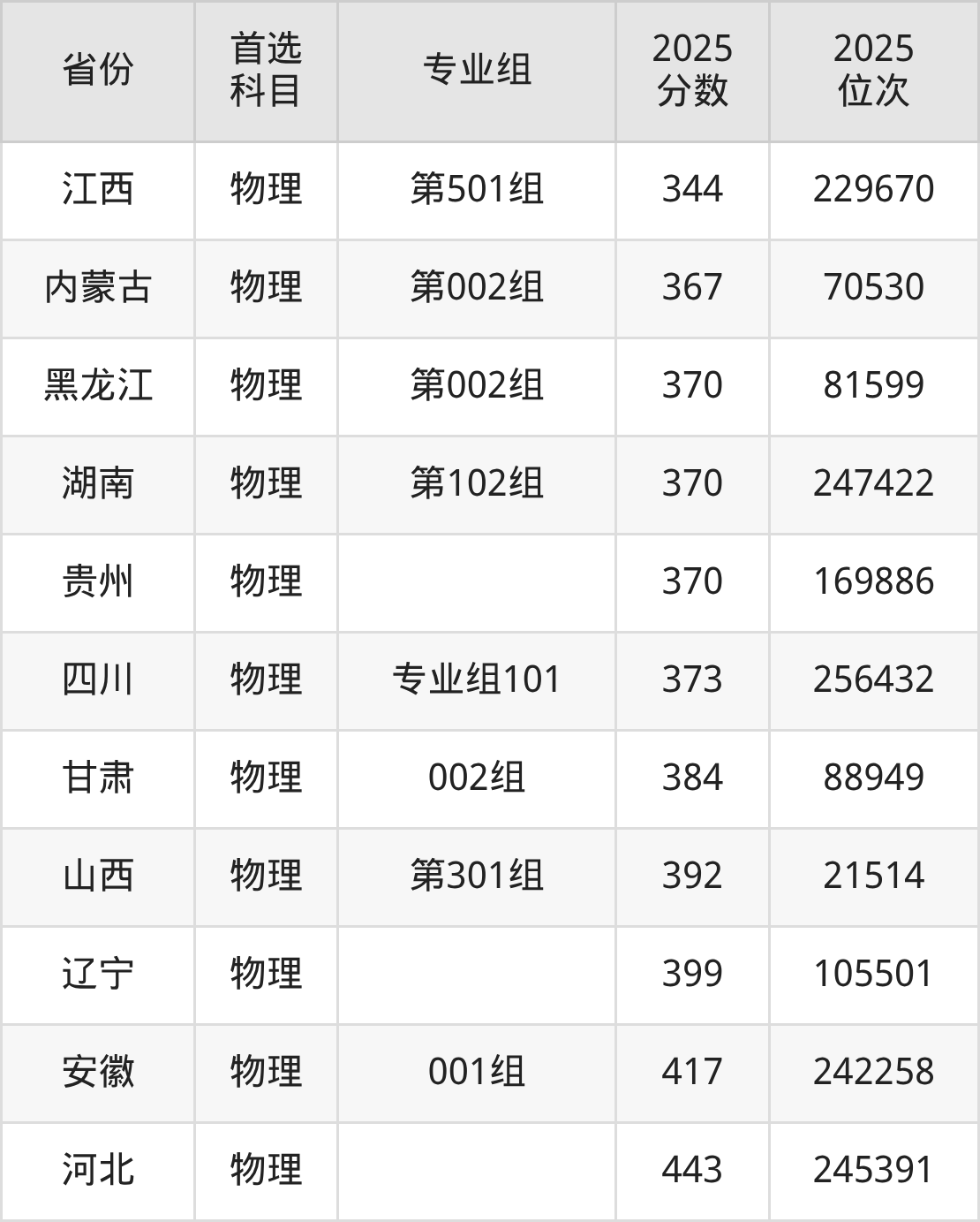 物理类最低分对应地区为吉林(第002组),录取位次为69588,超专科线179分;最高分对应地区为河北,录取位次为245391,超专科线243分。