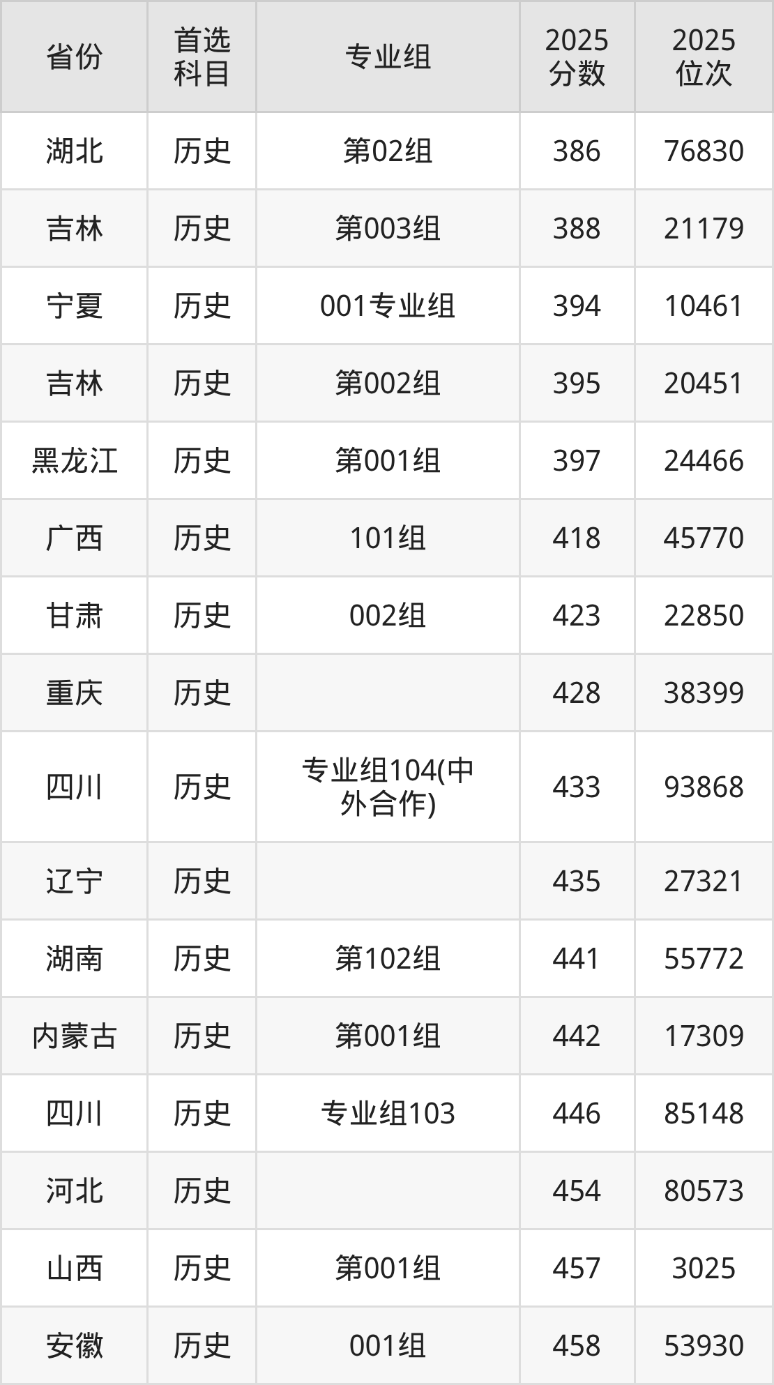 历史类:专业组101481分、60967名,专业组102475分、65102名,专业组103446分、85148名,专业组104(中外合作)433分、93868名;