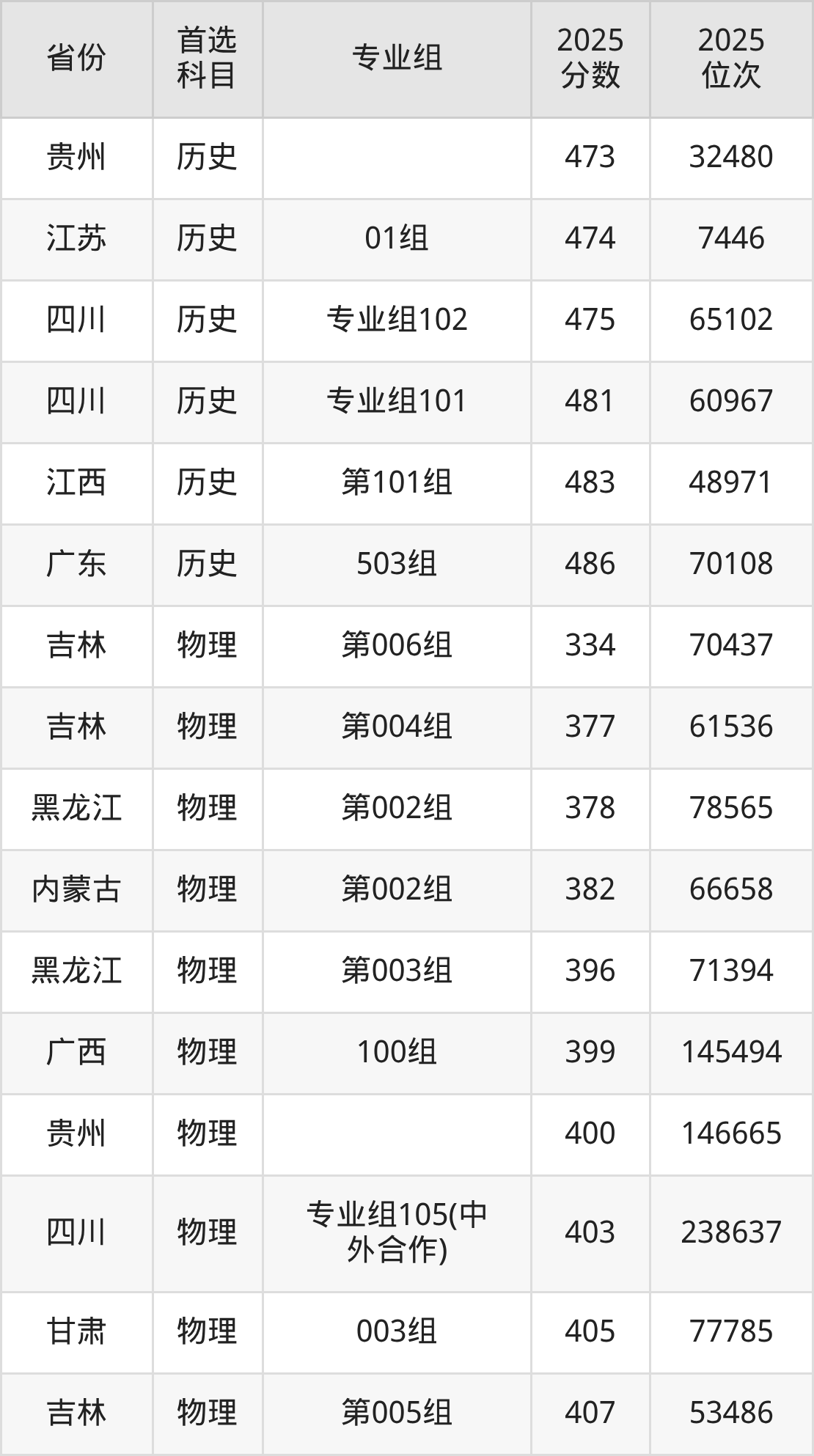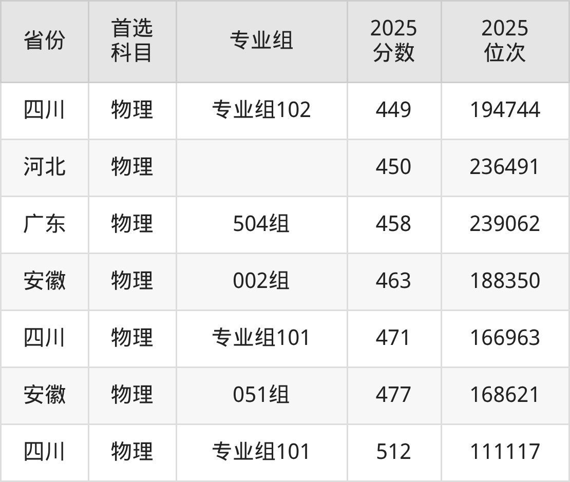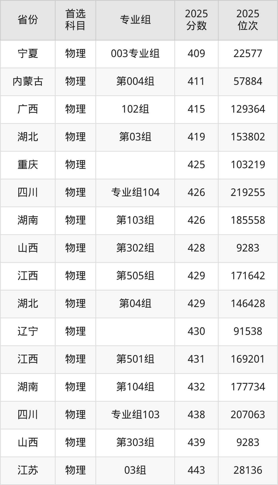 物理类:专业组101471分、166963名,专业组101512分、111117名,专业组102449分、194744名,专业组103438分、207063名,专业组104426分、219255名,专业组105(中外合作)403分、238637名;