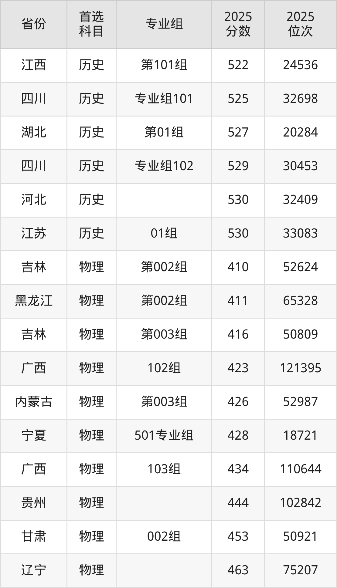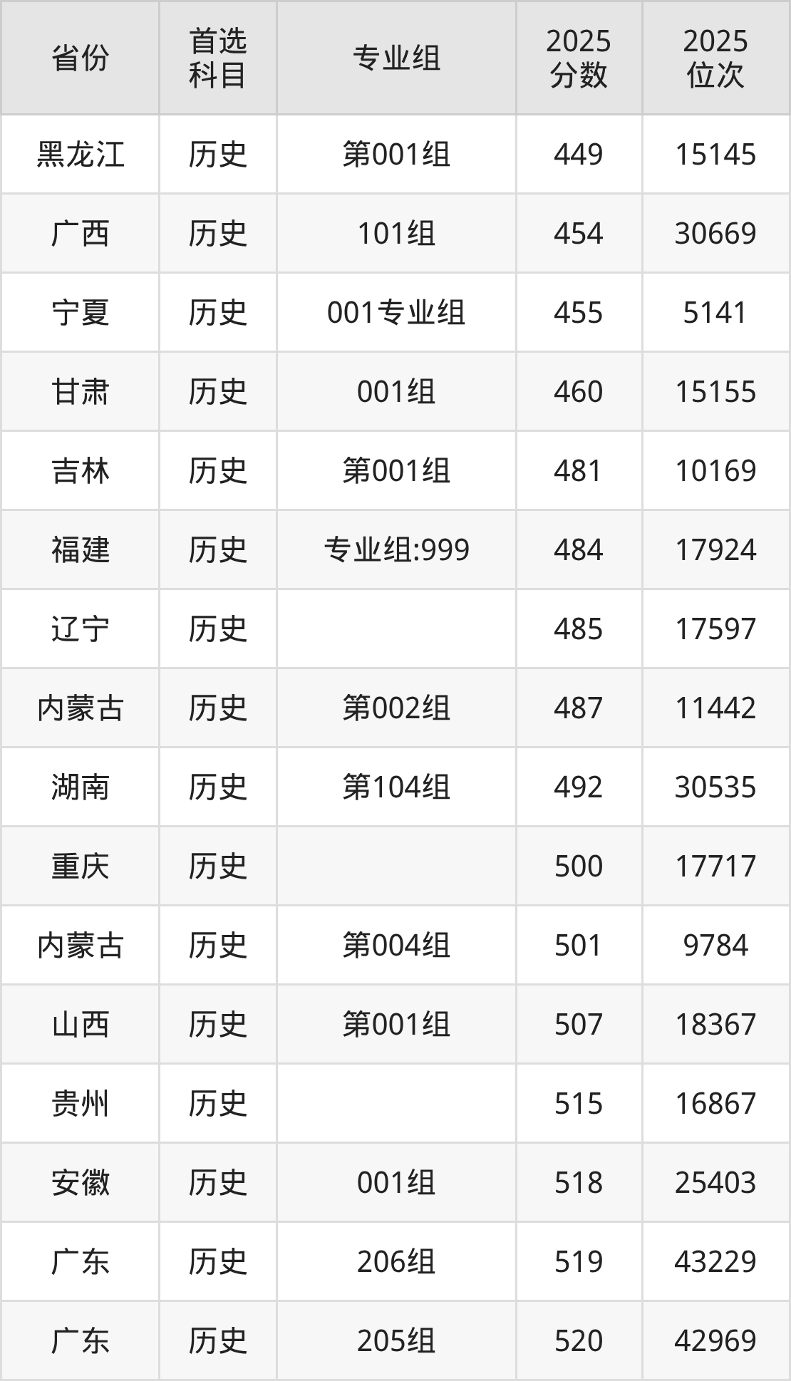 历史类最低分对应地区为黑龙江(第001组),录取位次为15145,超本科线44分;最高分对应地区为江苏(01组),录取位次为33083,超本科线48分。