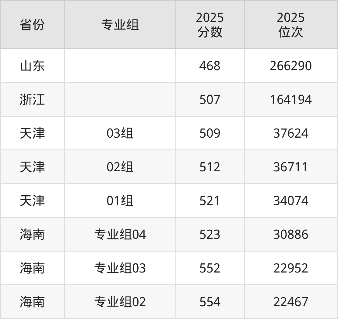 最低分对应地区为山东,录取位次为266290,超一段线71分;最高分对应地区为海南(专业组02),录取位次为22467,超本科线74分。