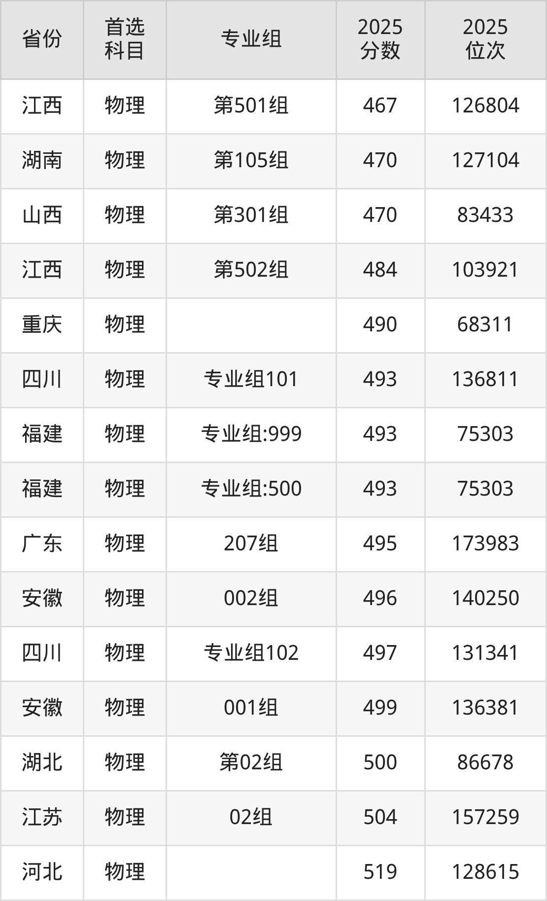 物理类最低分对应地区为吉林(第002组),录取位次为52624;最高分对应地区为河北,录取位次为128615,超本科线63分。