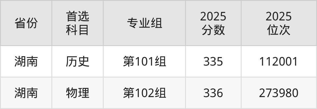 历史类最低分对应地区为湖南(第101组),录取位次为112001,超专科线135分。