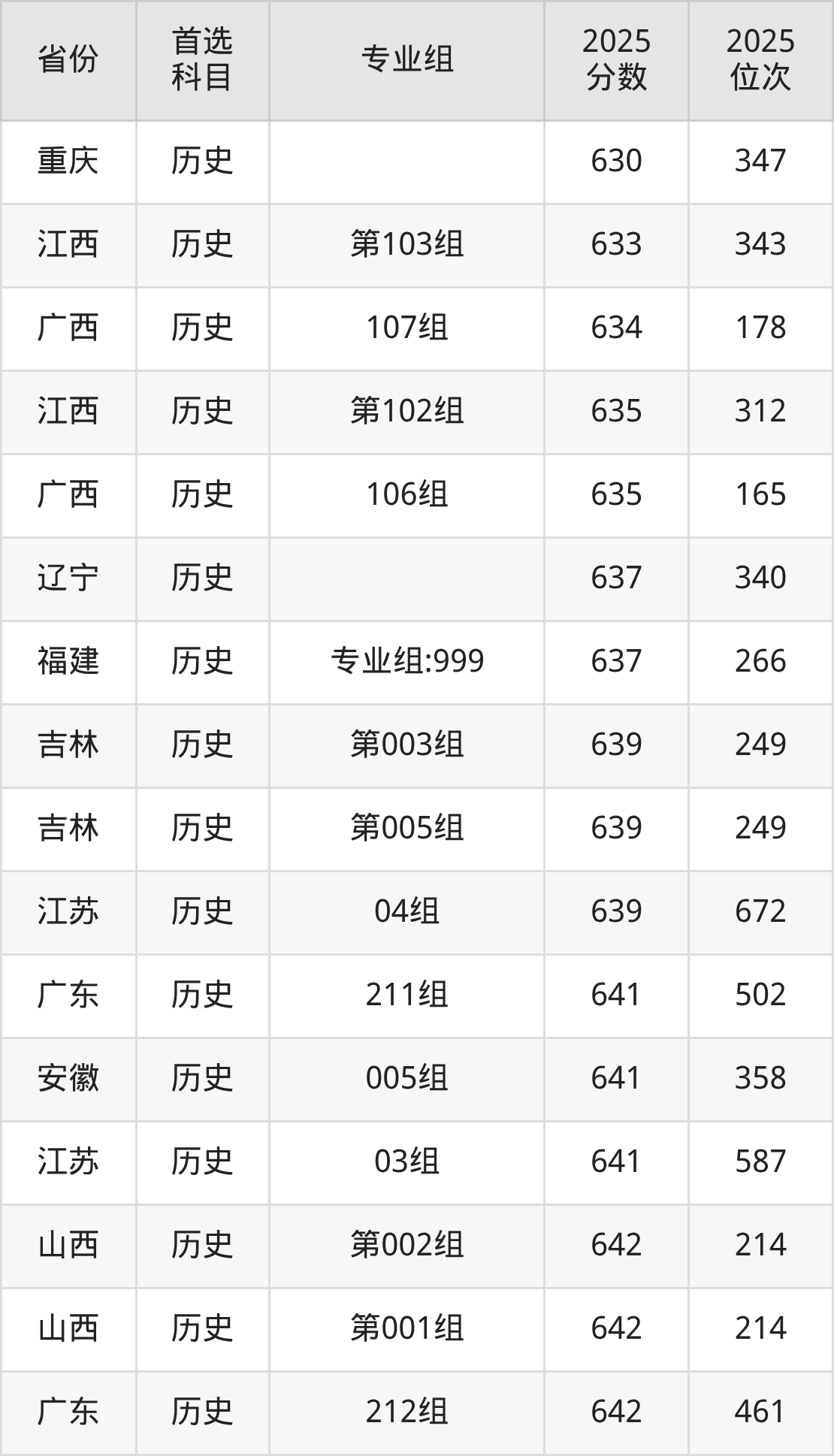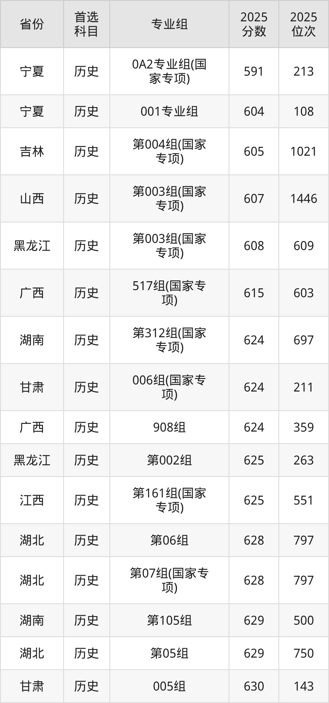 历史类:第05组629分、750名,第06组628分、797名,第07组(国家专项)628分、797名;
