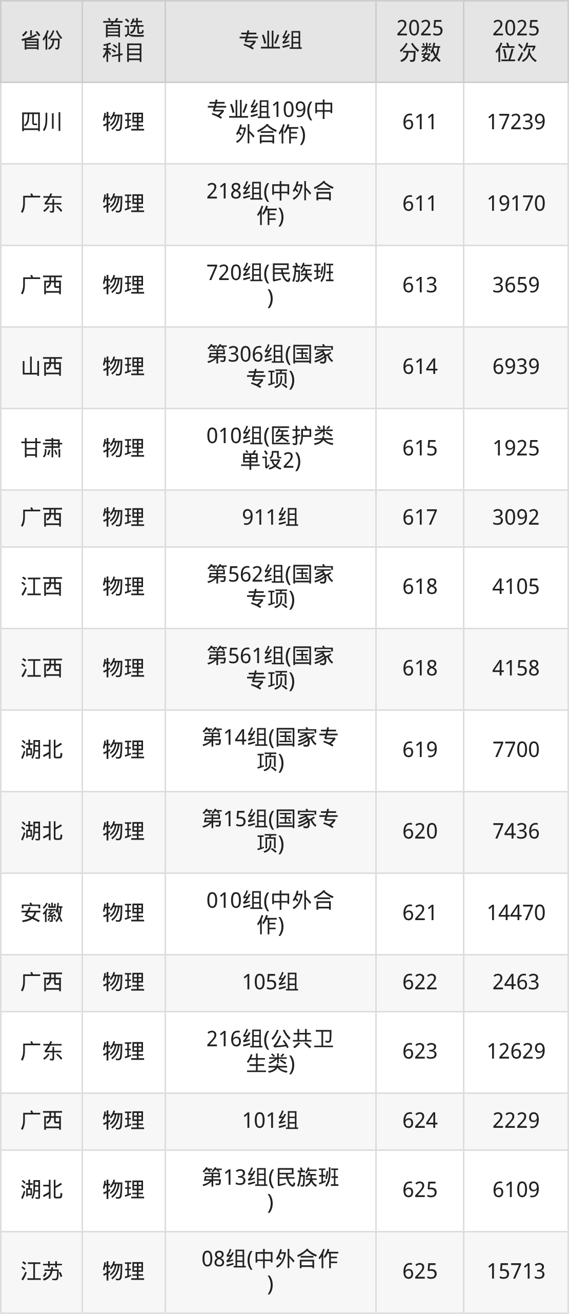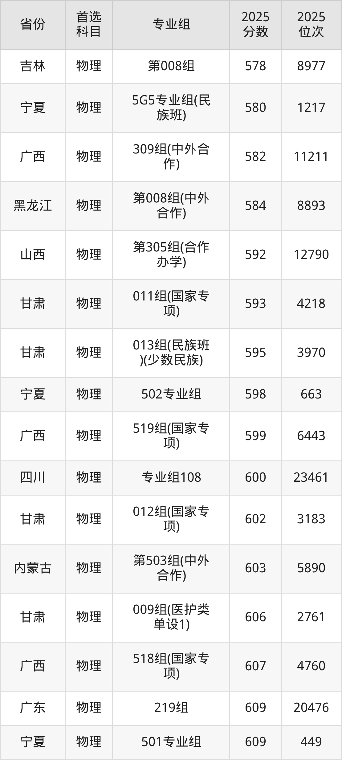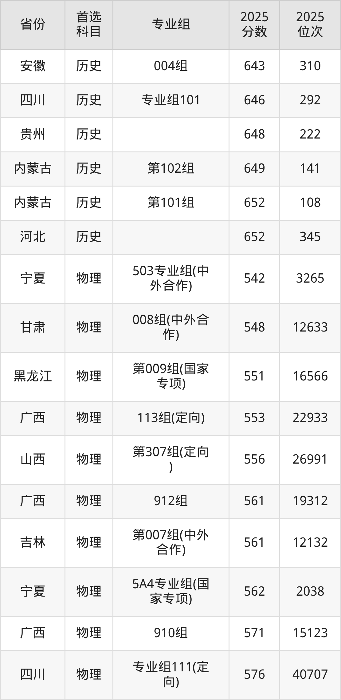 物理类最低分对应地区为宁夏(503专业组(中外合作)),录取位次为3265;最高分对应地区为湖南(第107组),录取位次为185,超本科线275分。