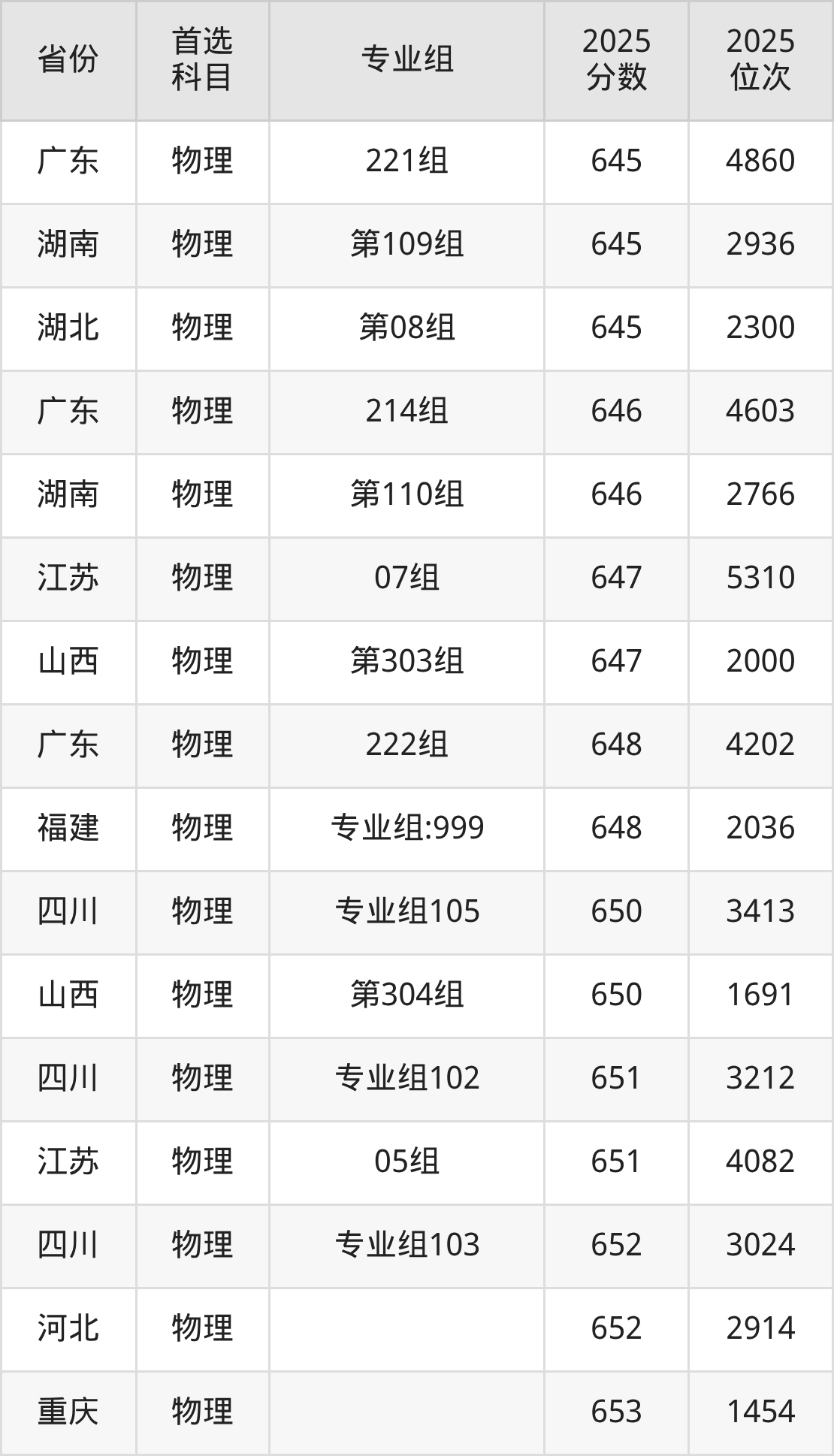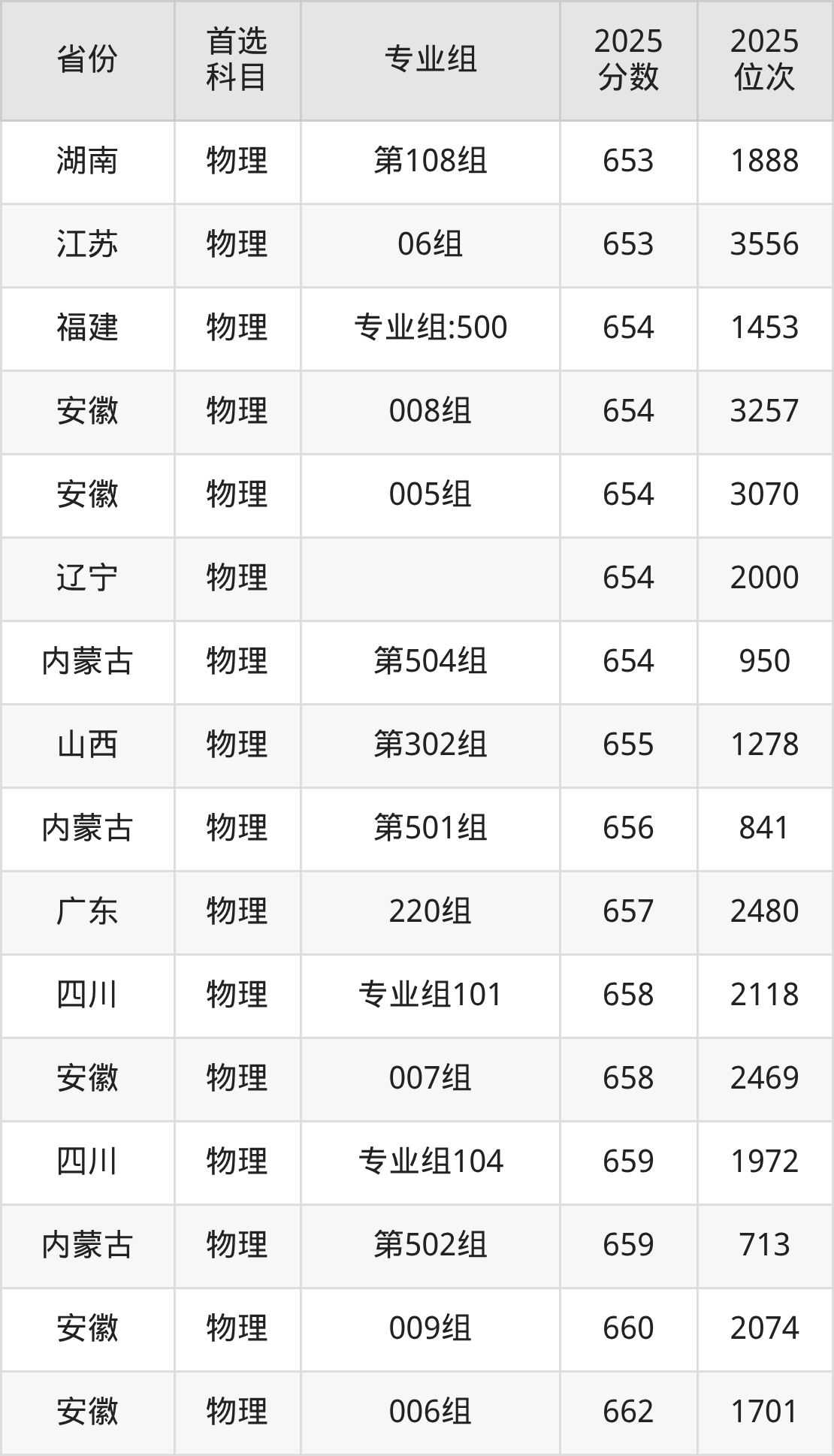 物理类:第06组641分、4287名,第07组(国家专项)623分、8760名,第08组643分、3901名,第09组653分、2315名,第10组644分、3712名,第11组647分、3218名,第12组649分、2879名,第13组(国家专项)627分、7659名,第14组(民族班)635分、5543名;
