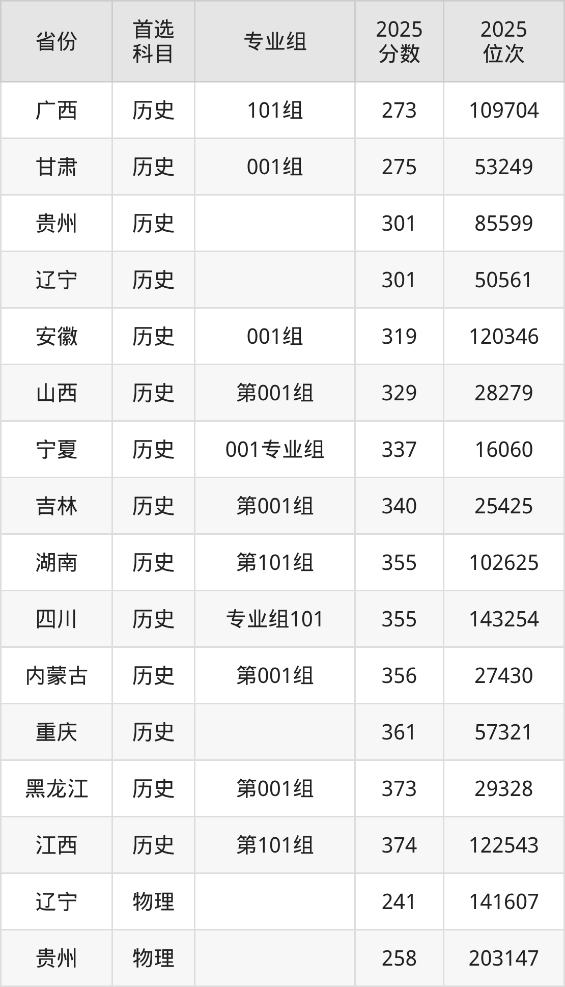 历史类最低分对应地区为广西(101组),录取位次为109704,超专科线73分;最高分对应地区为江西(第101组),录取位次为122543,超专科线84分。