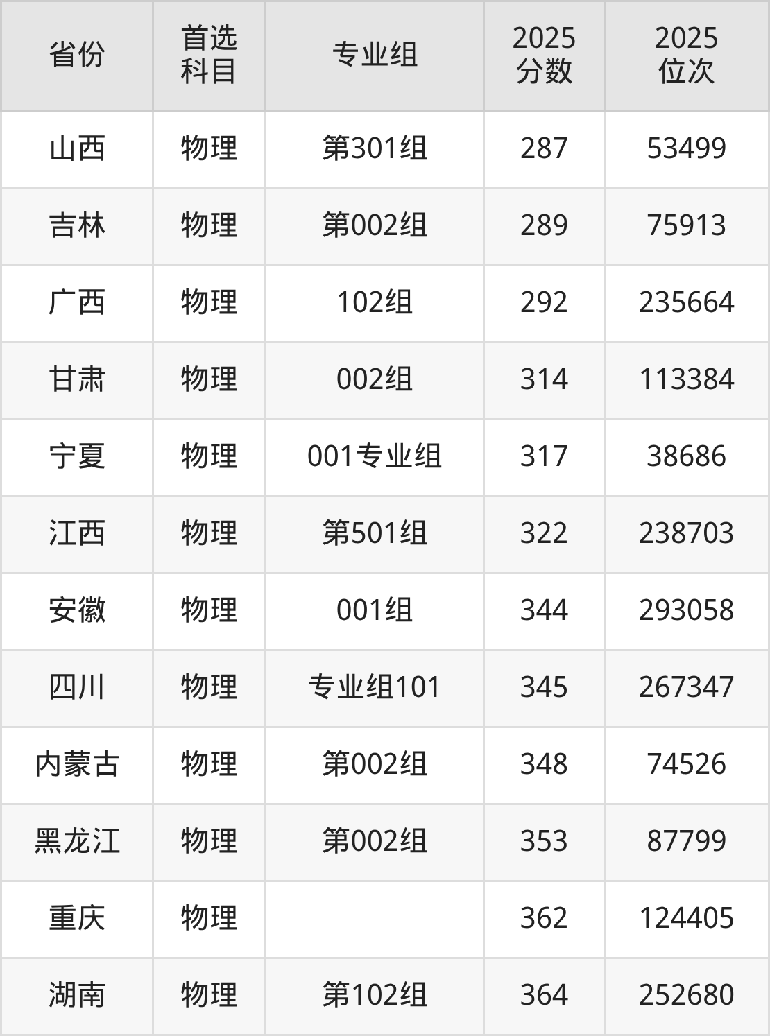 物理类最低分对应地区为辽宁,录取位次为141607,超专科线91分;最高分对应地区为湖南(第102组),录取位次为252680,超专科线164分。
